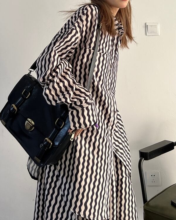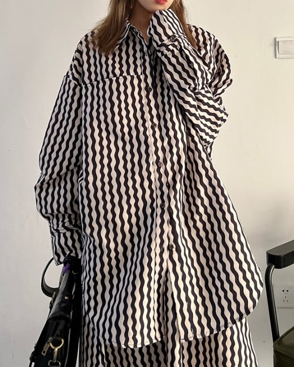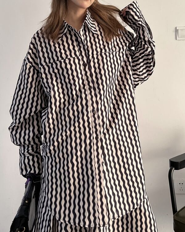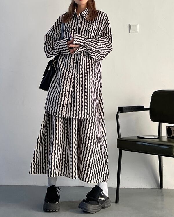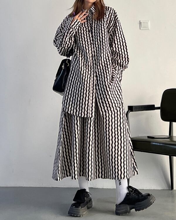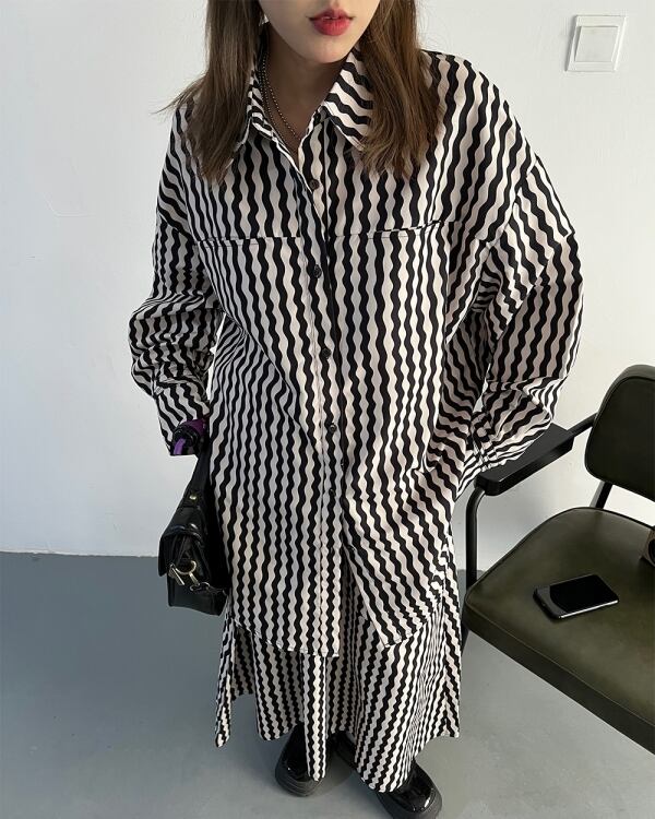 ウェーブストライプ柄が目を惹くロングシャツです。