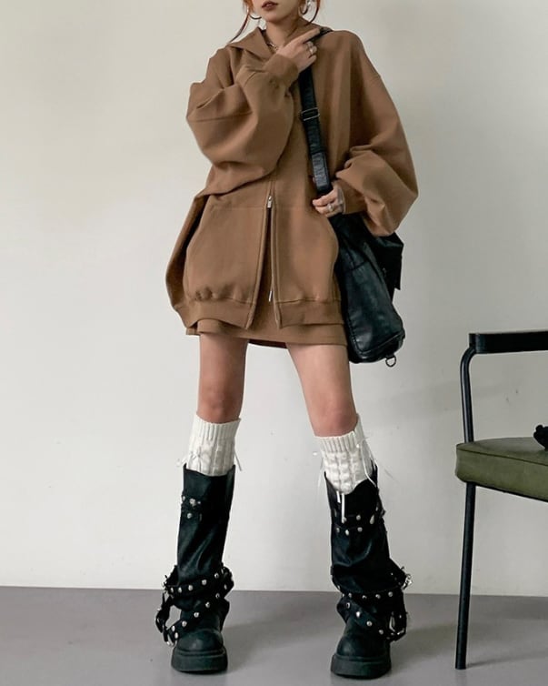 ジップアップパーカーとミニ丈スカートのセットアップです。スポーティーさとカジュアルな可愛さを両立したデザインです。