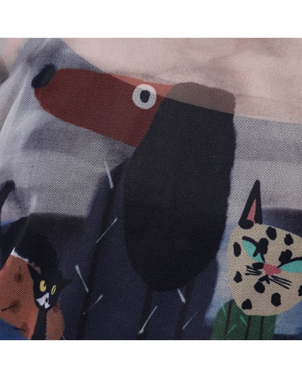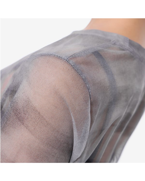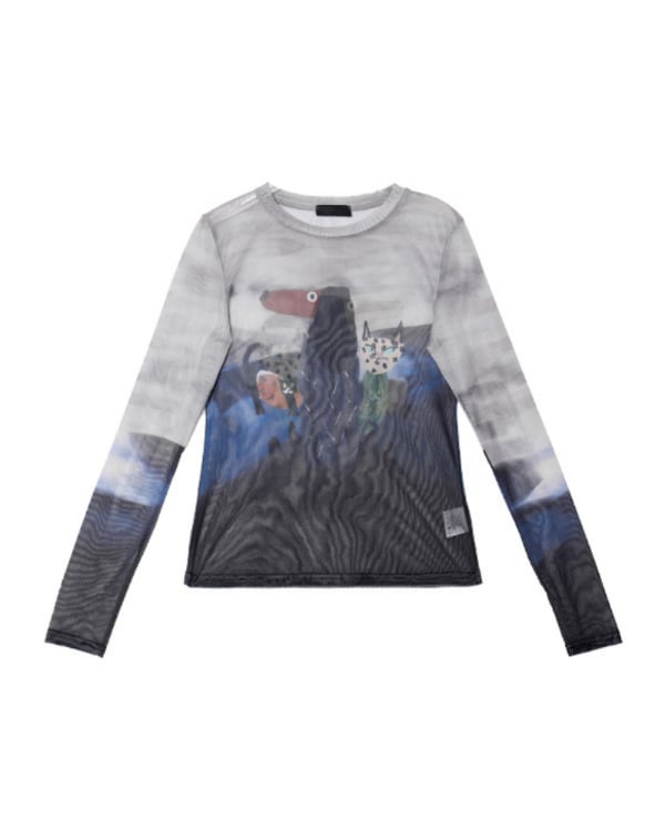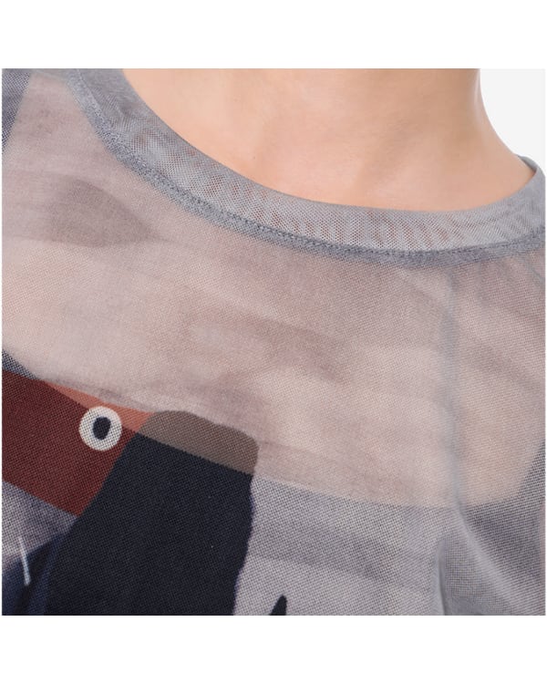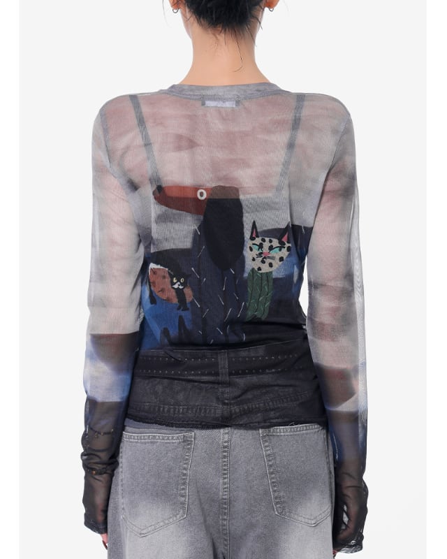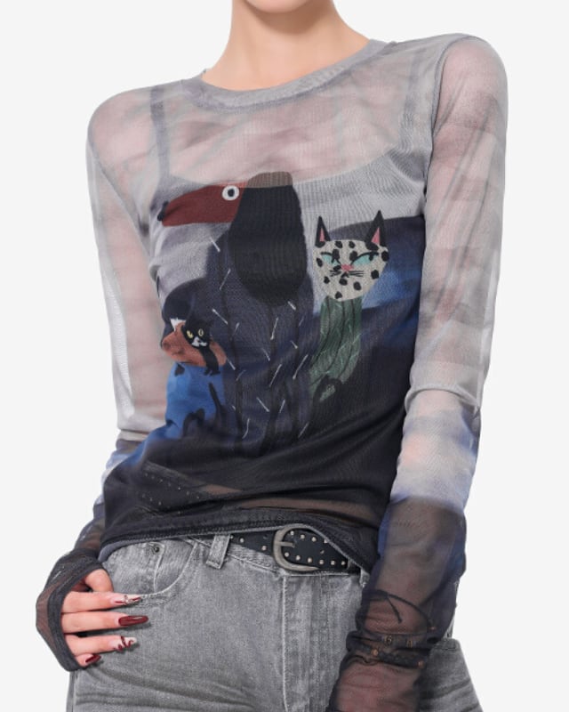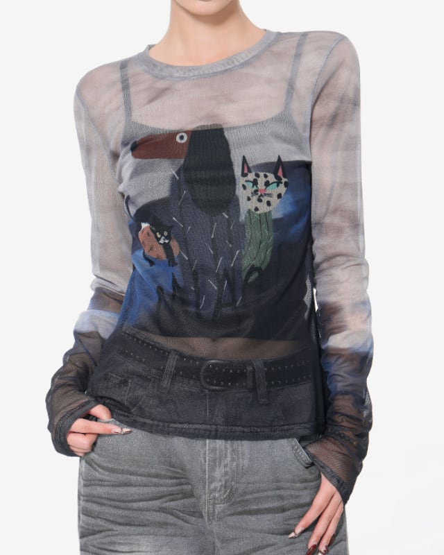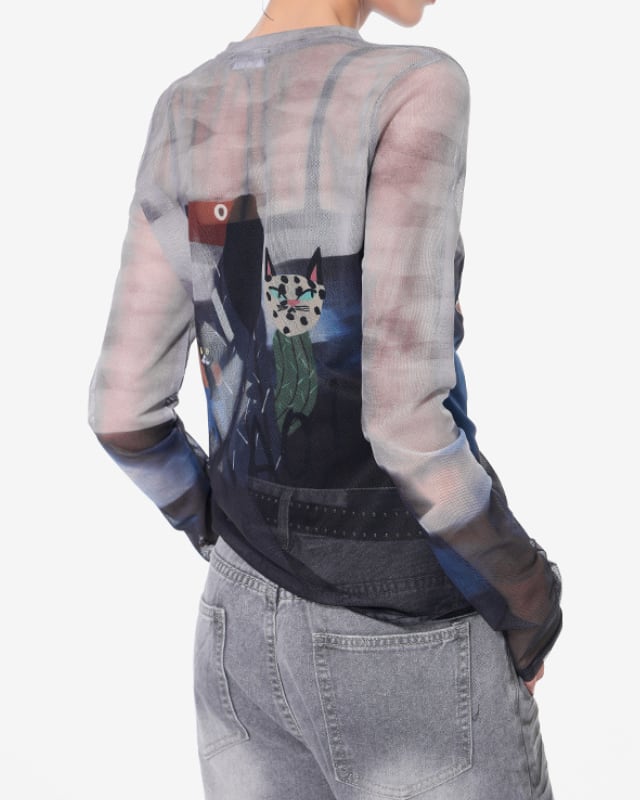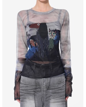 メッシュ素材のクルーネックトップスです。透け感のある生地と個性的なイラストで主役トップスに。