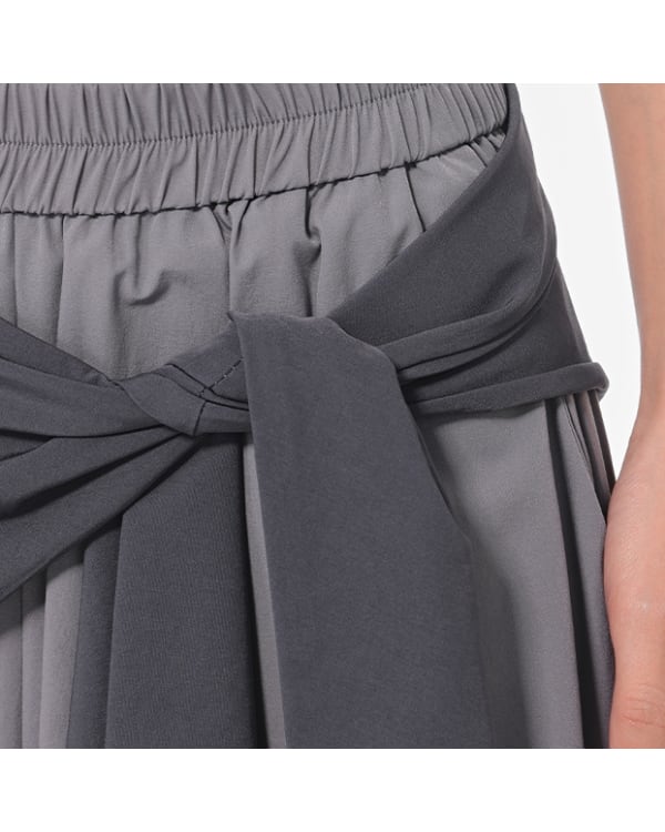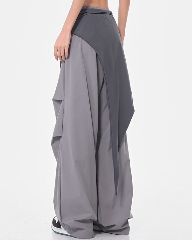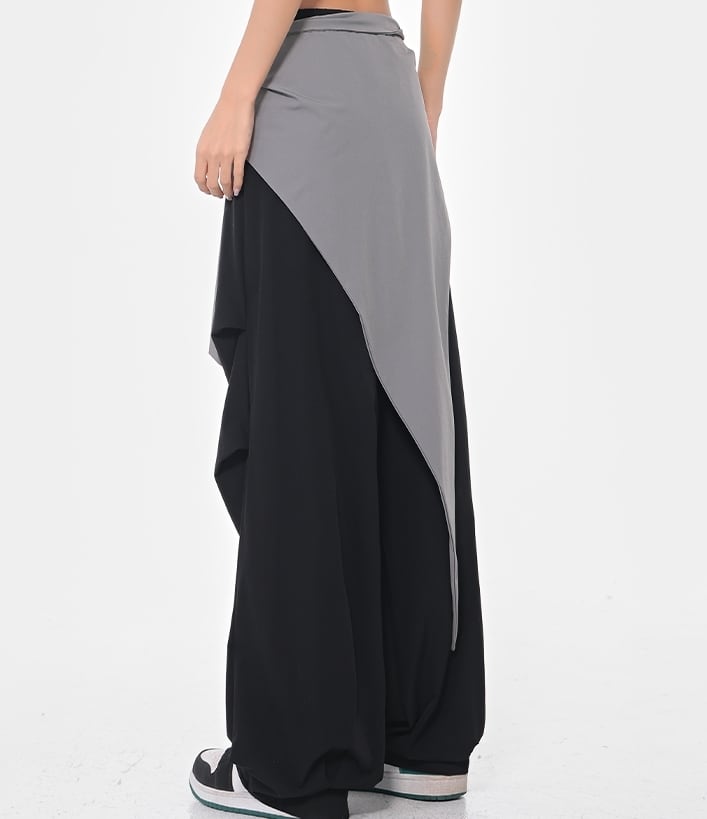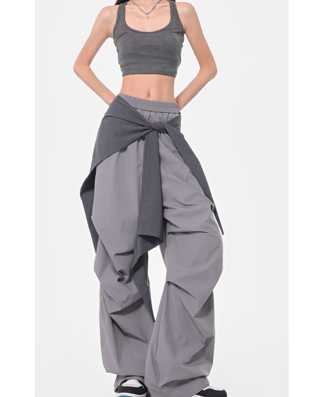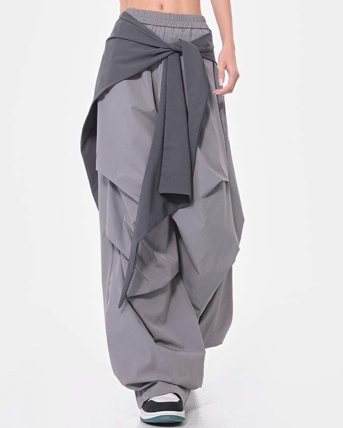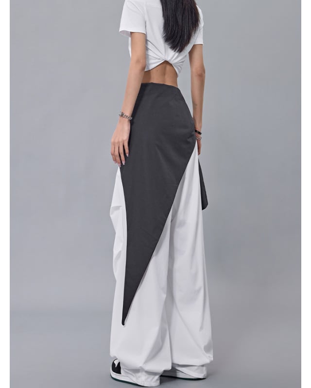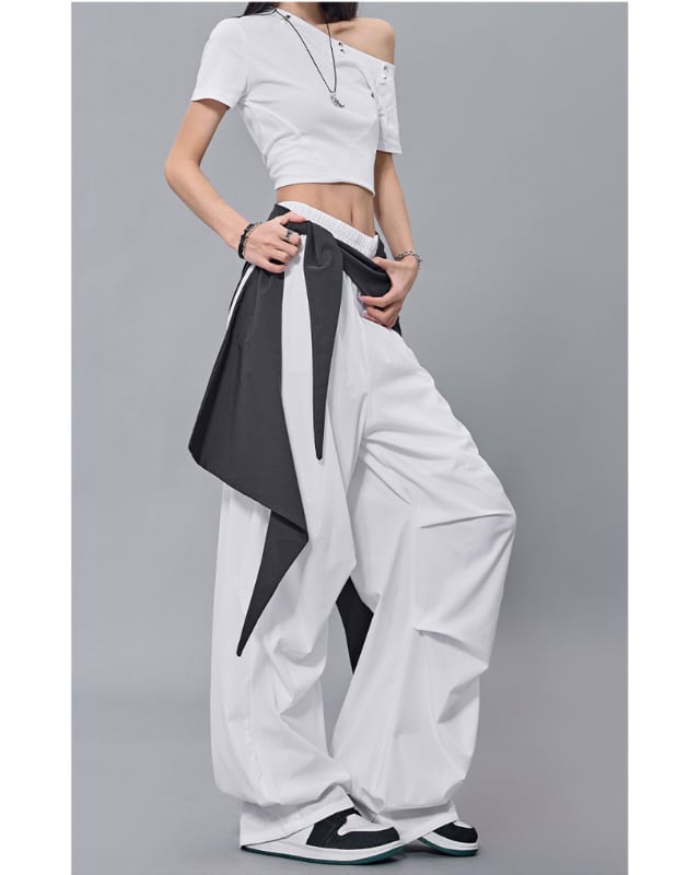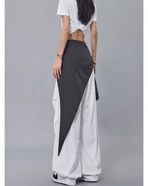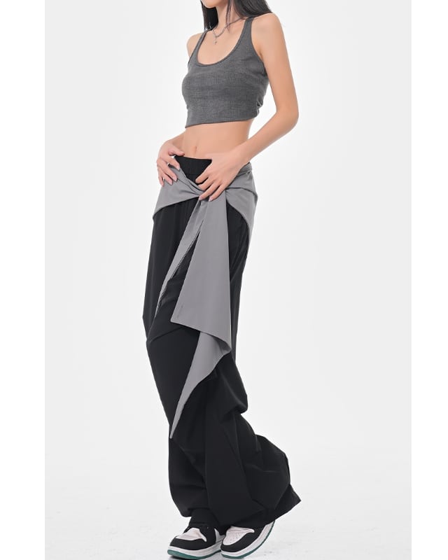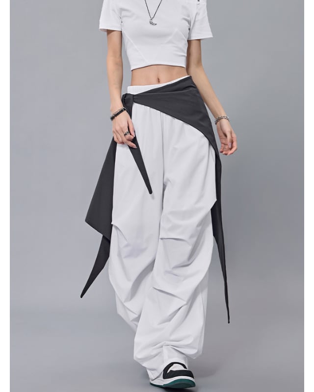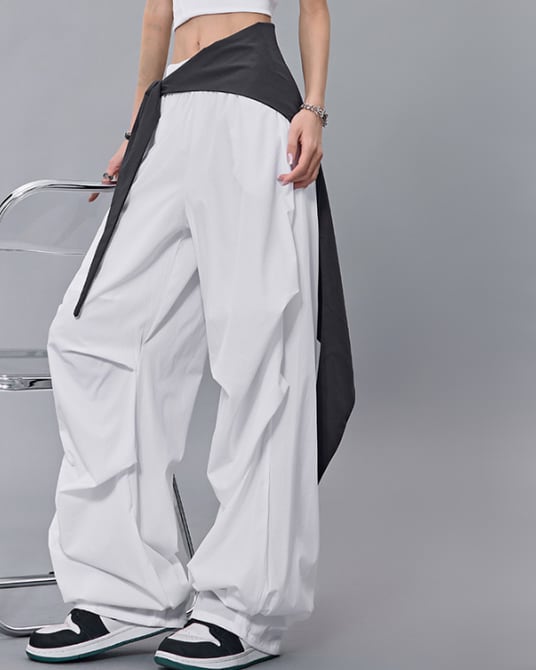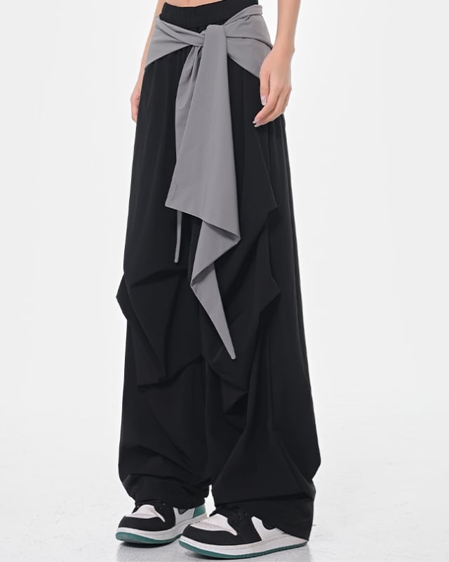 ストリート映え抜群のバイカラー切り替えデザインのワイドパンツ。ウエストのリボンがアクセントとなり、着こなしに個性をプラスします。
