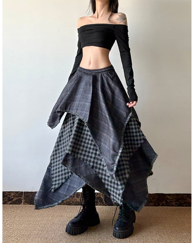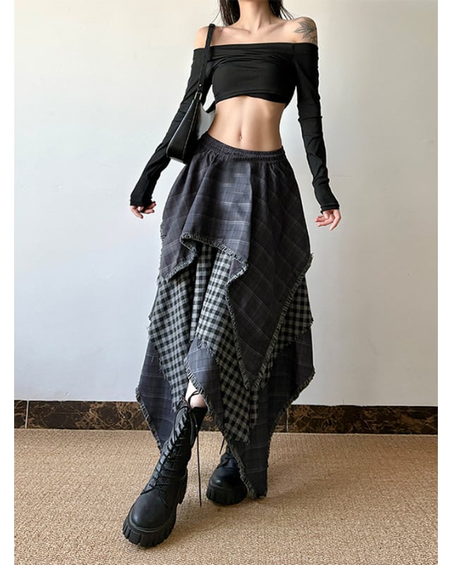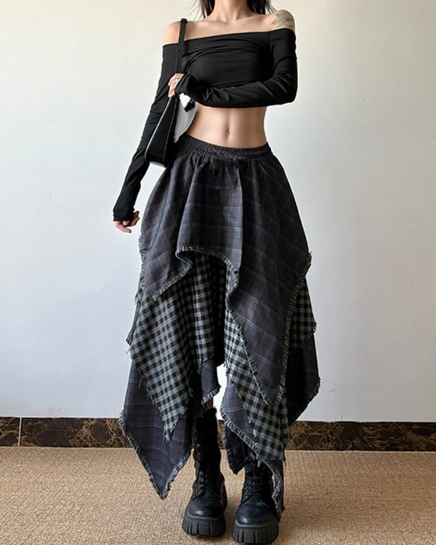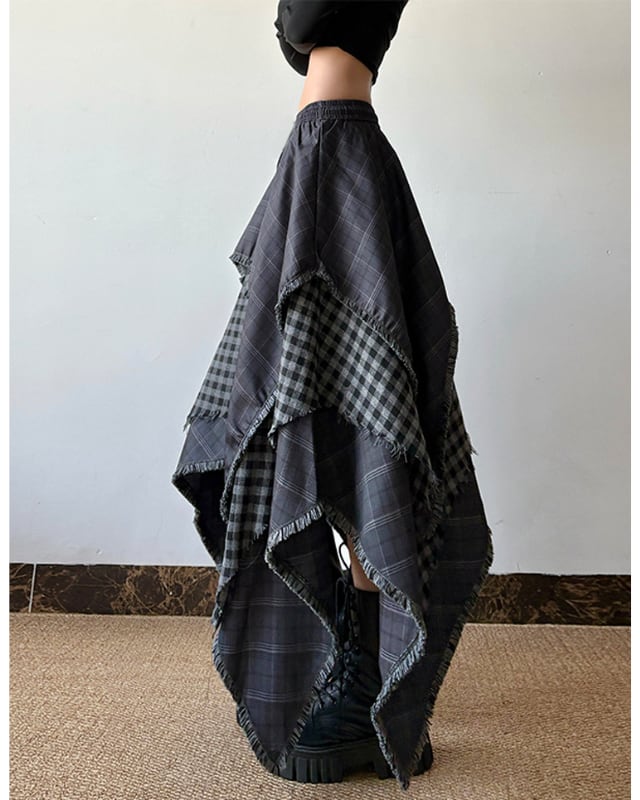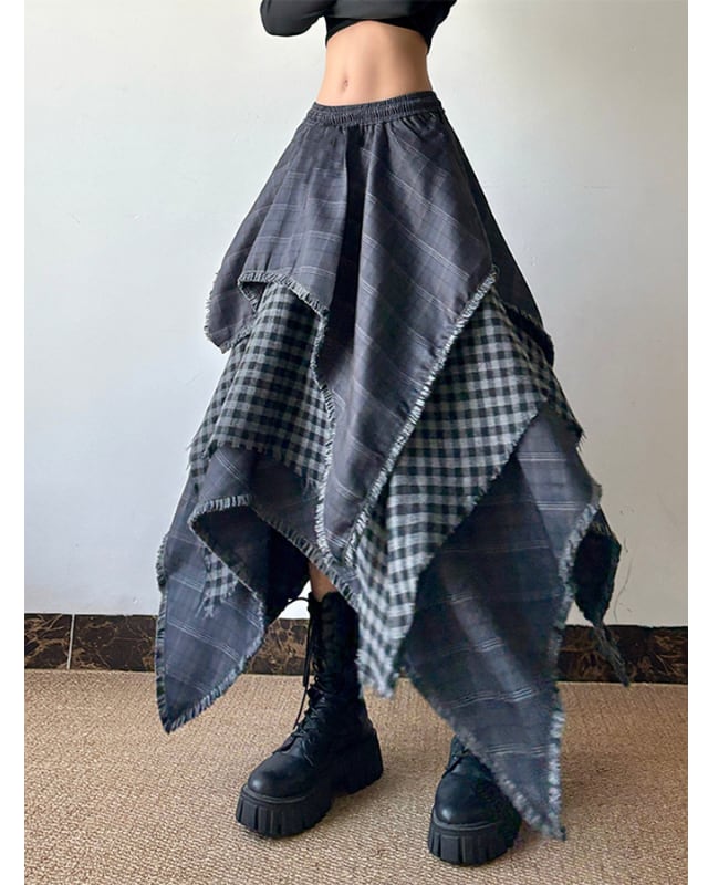 アシンメトリーなヘムラインとレイヤードデザインが目を惹くロングスカート。チェック柄が個性的なアクセントとなり、シンプルながらも洗練されたスタイルを演出します。