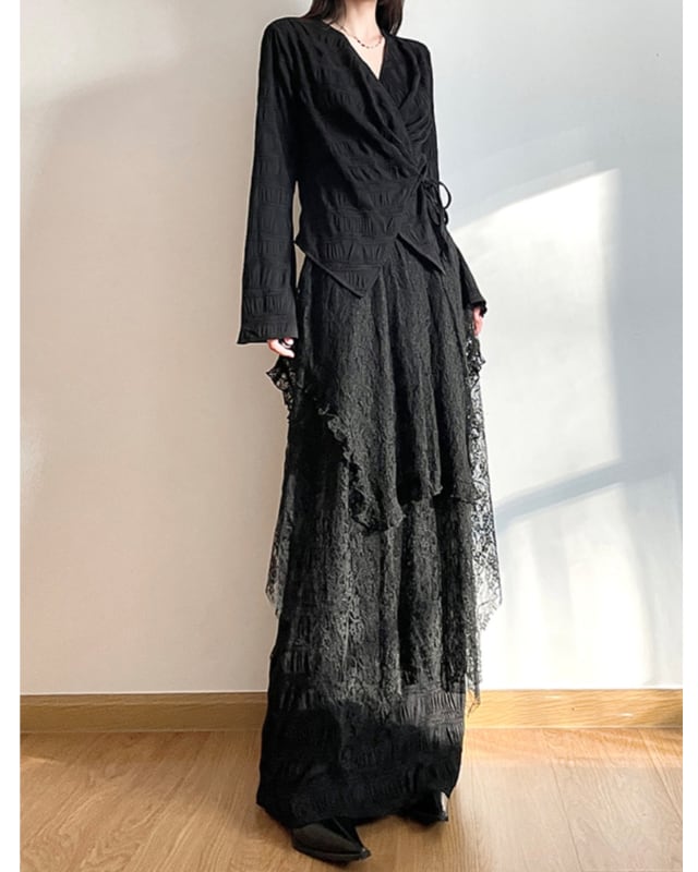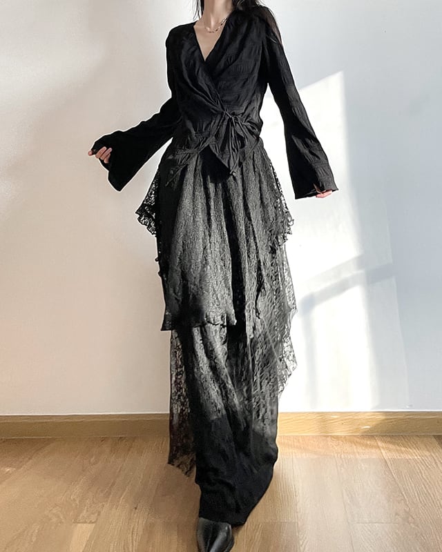 繊細なレースとエアリーなチュールが重なり合う、フェミニンなフレンチスタイルのスカートとルーズなシルエットのトップスのセットアップです。スカートはシンメトリーなヘムラインが、動きのある立体感とこなれた抜け感を演出します。