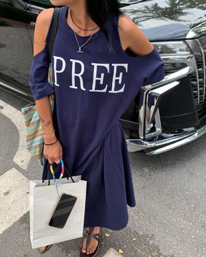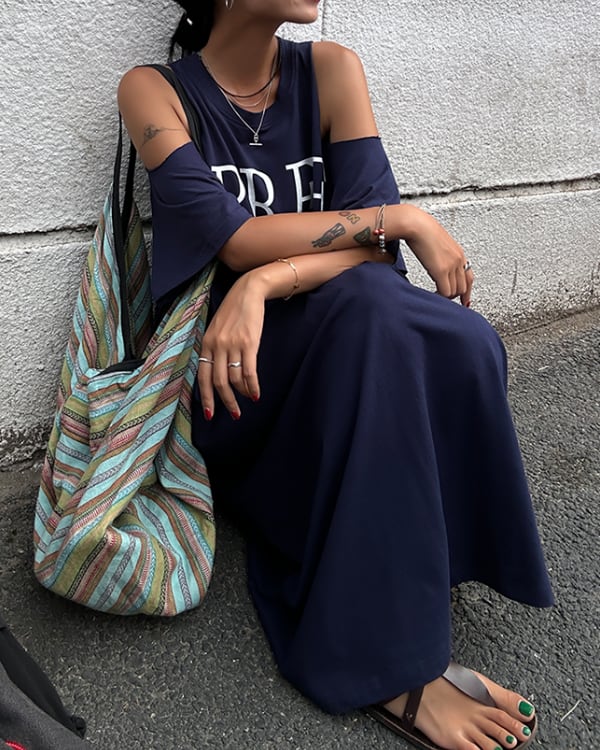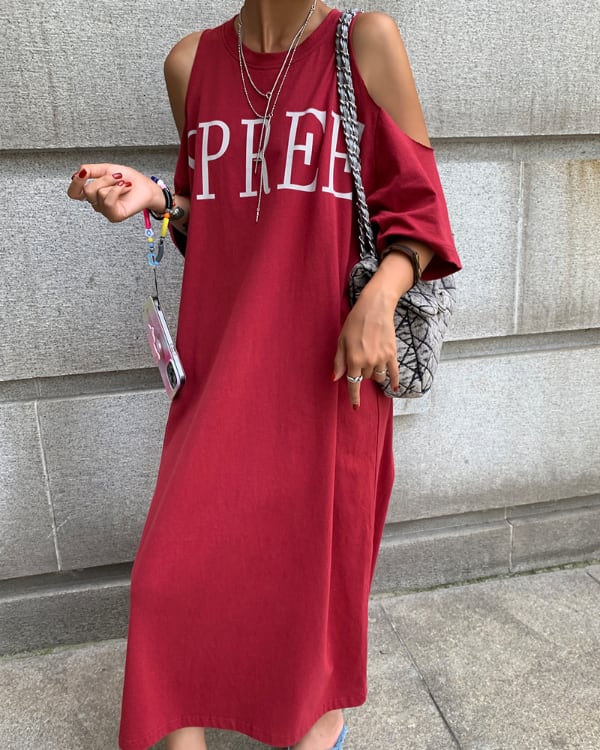 肩出しデザインが抜け感を演出する、ロング丈のTシャツワンピース。