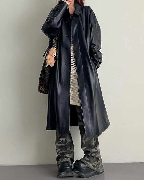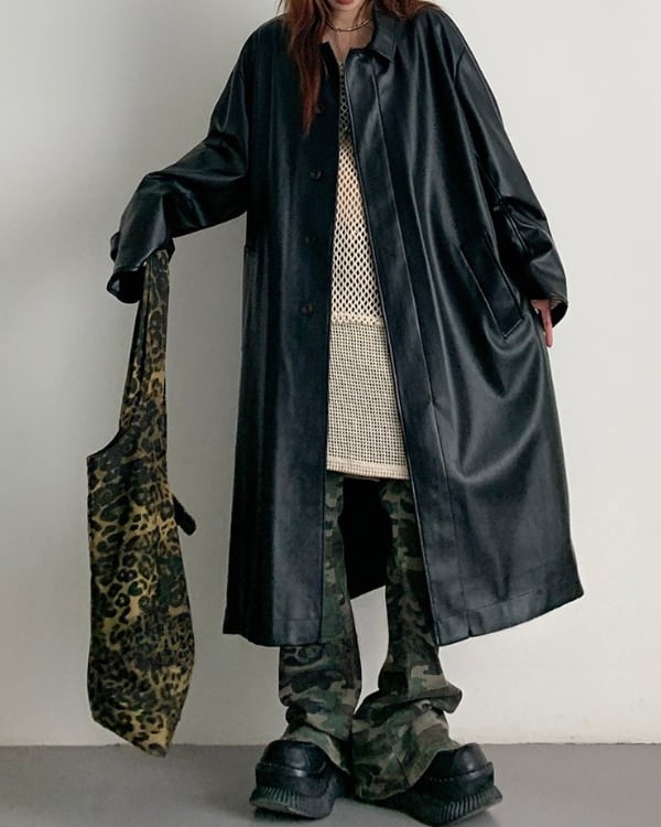オーバーサイズシルエットがこなれ感を演出するフェイクレザーコート。