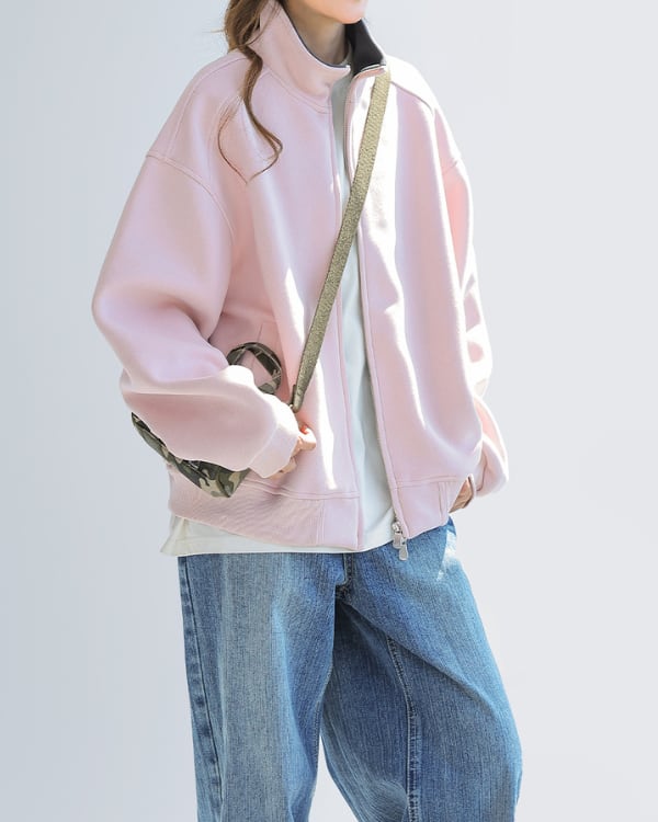 オーバーサイズデザインで、リラックスした着心地ながら、スタンドカラーがスタイリッシュな印象を与えます。