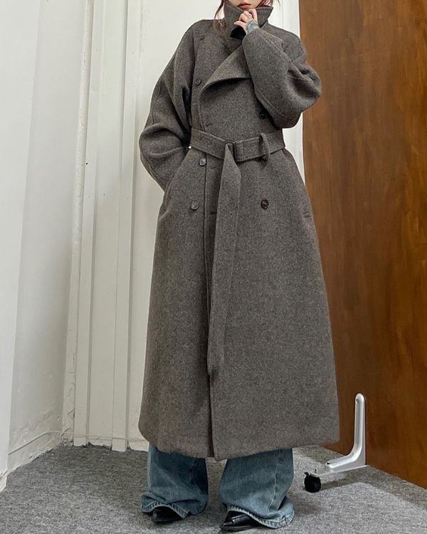 ボリュームのあるシルエットが印象的なダブルブレストのロングコート。