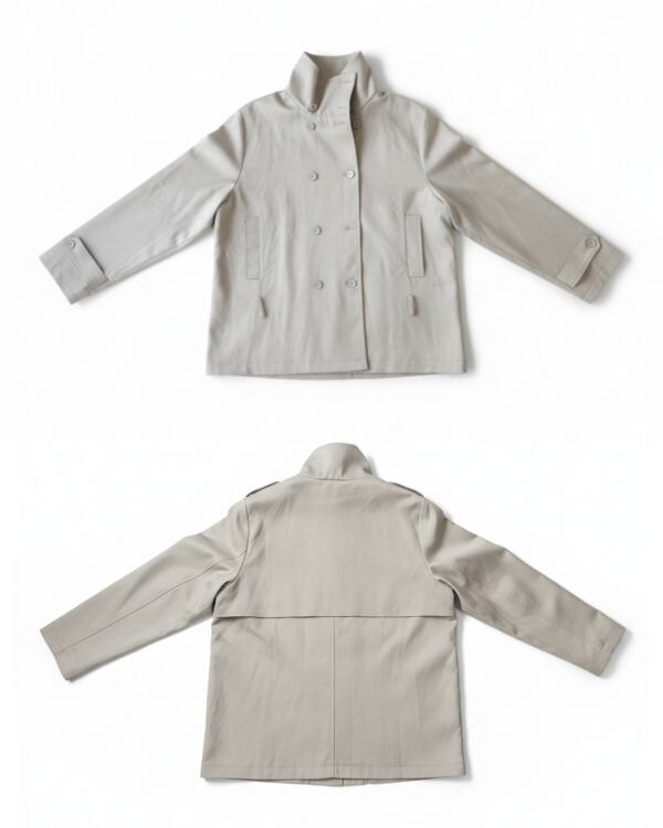 ショート丈に落とし込んだトレンチデザインが印象的なアウター。ベルトディテールと立体的なフォルムが、モードなこなれ感を演出します。