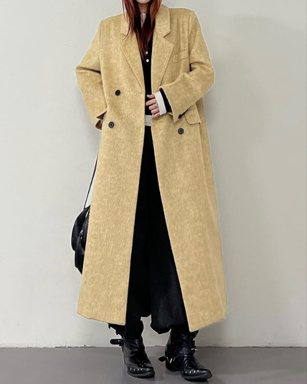 構築的なテーラードラインが際立つダブルブレストのロングコートです。