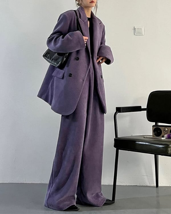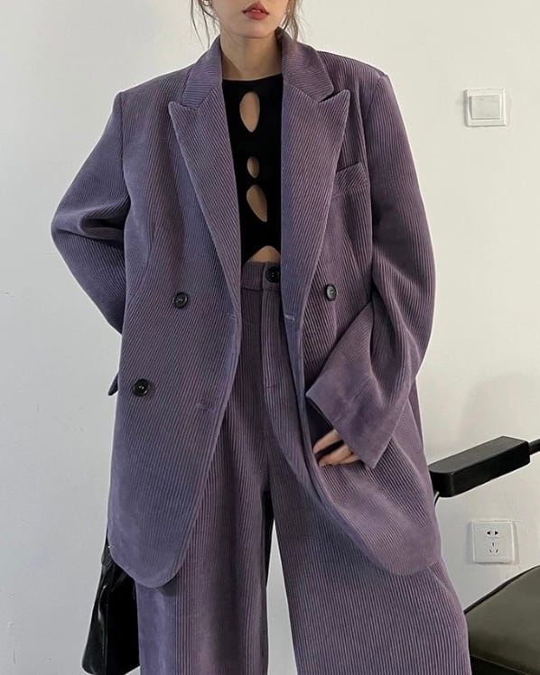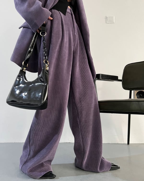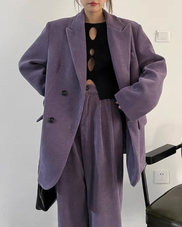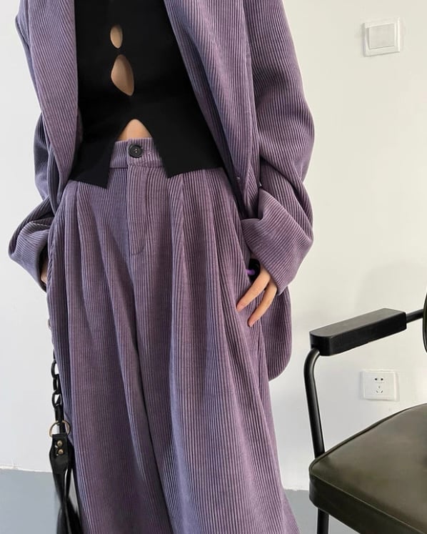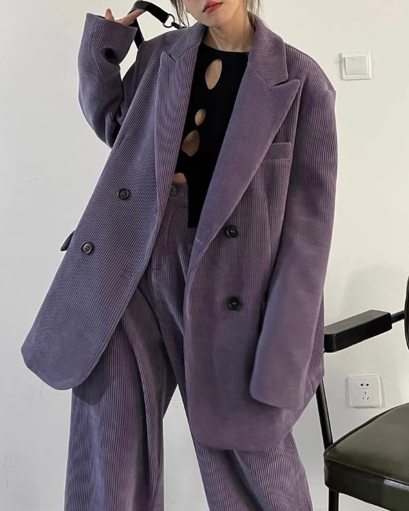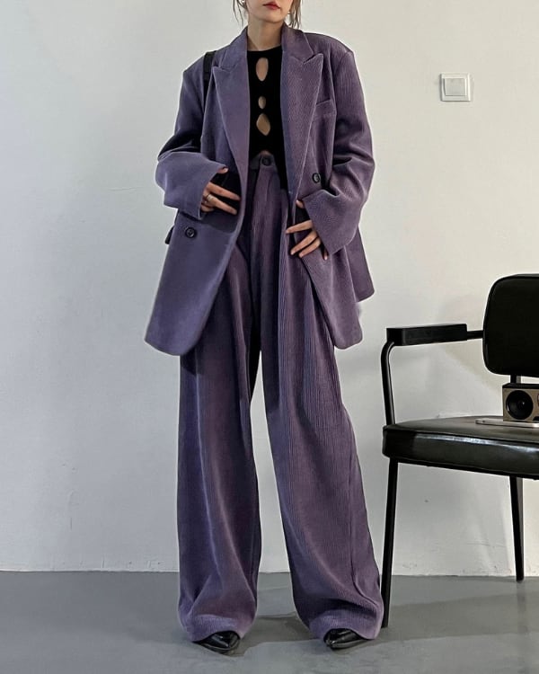 コーデュロイの立体感が、ムードのあるシルエットを引き立てるセットアップ。ダブルジャケット×ワイドパンツのバランスで、ラフに合わせても存在感が決まります。