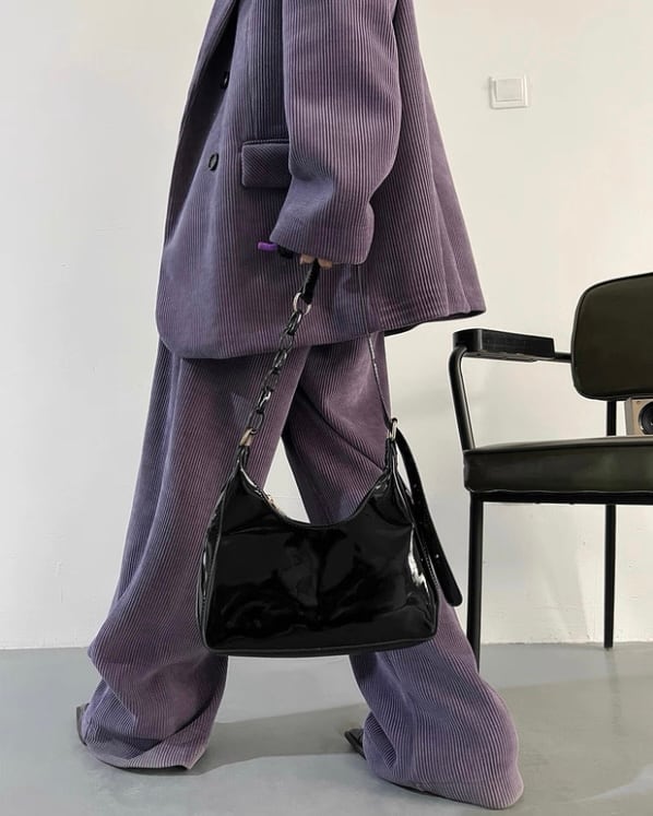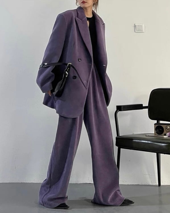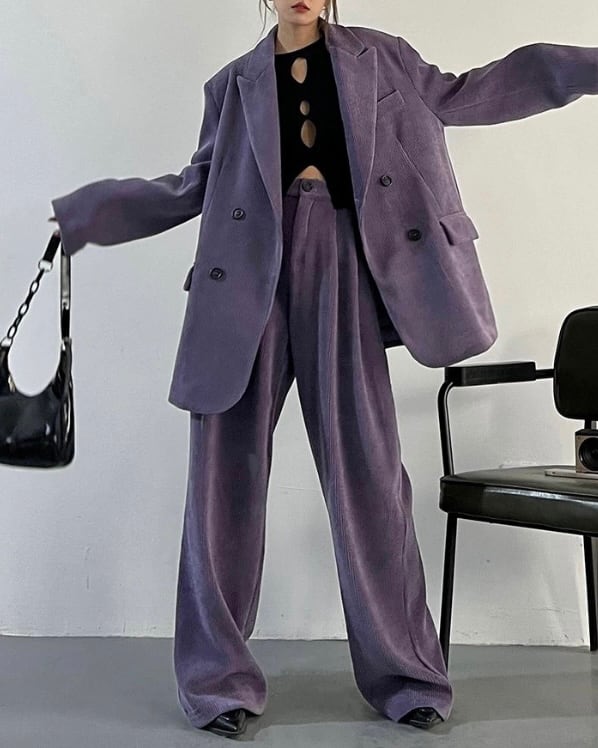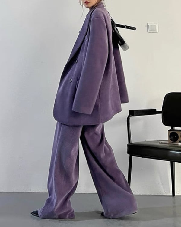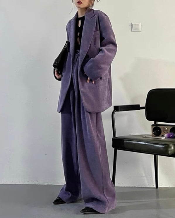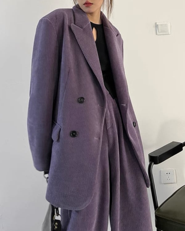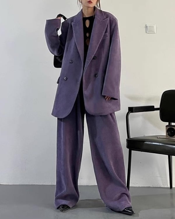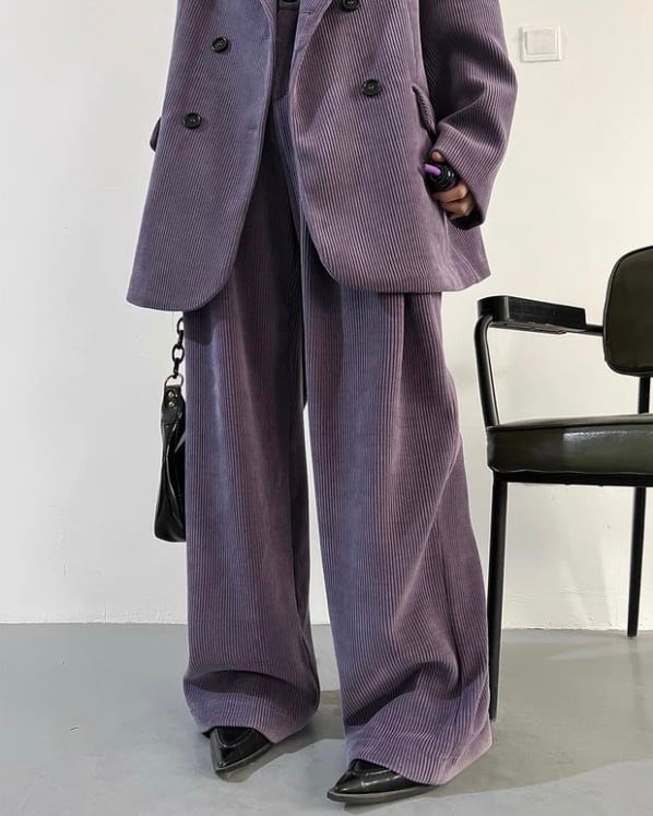 コーデュロイの立体感が、ムードのあるシルエットを引き立てるセットアップ。ダブルジャケット×ワイドパンツのバランスで、ラフに合わせても存在感が決まります。