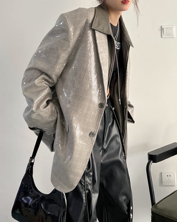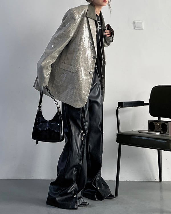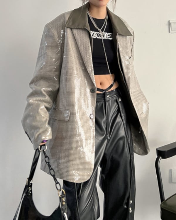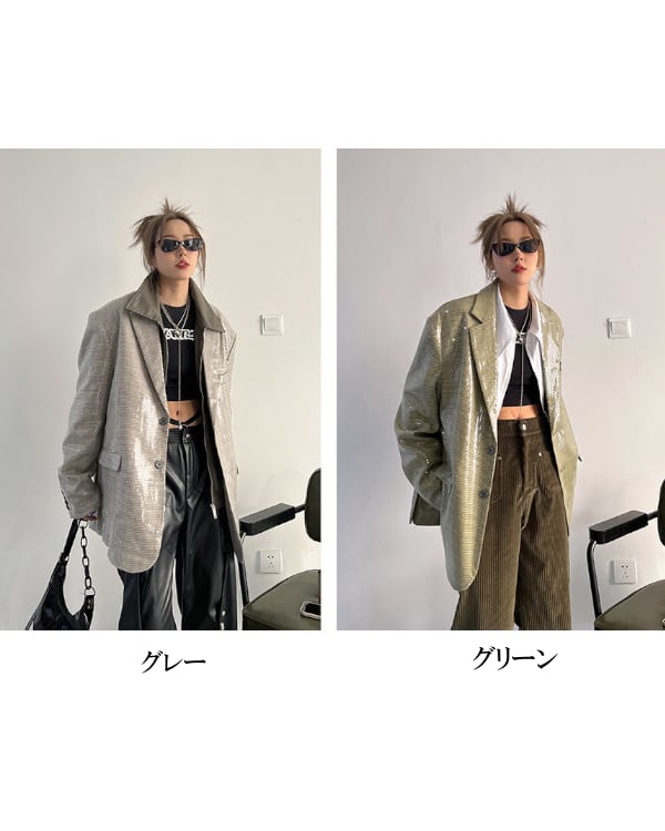 メタリックな生地が、スタイリングに鋭い存在感を与えるテーラードジャケット。程よく構築的なシルエットが、ラフなボトムスともバランス良くまとまります。