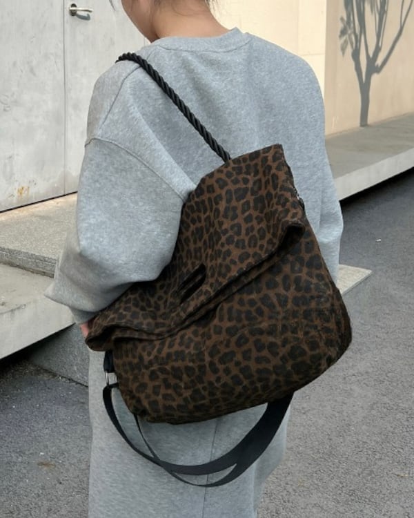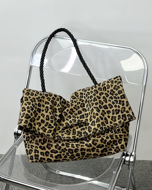 レオパード柄と立体的な折りデザインが、スタイリングにリズムを加えるトートバッグ。ロープハンドルとフラップ構造がアクセントになり、持つだけで印象が引き締まります。