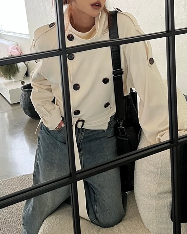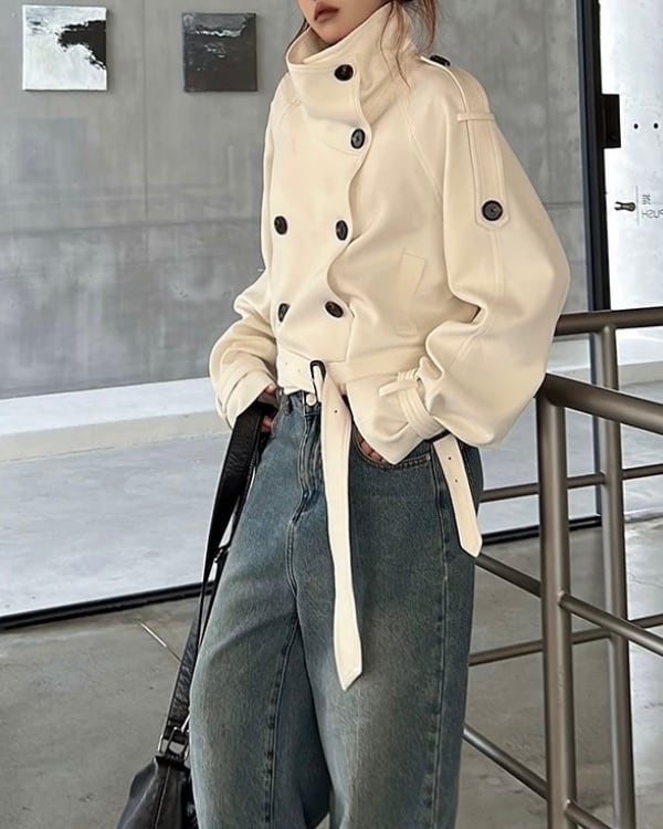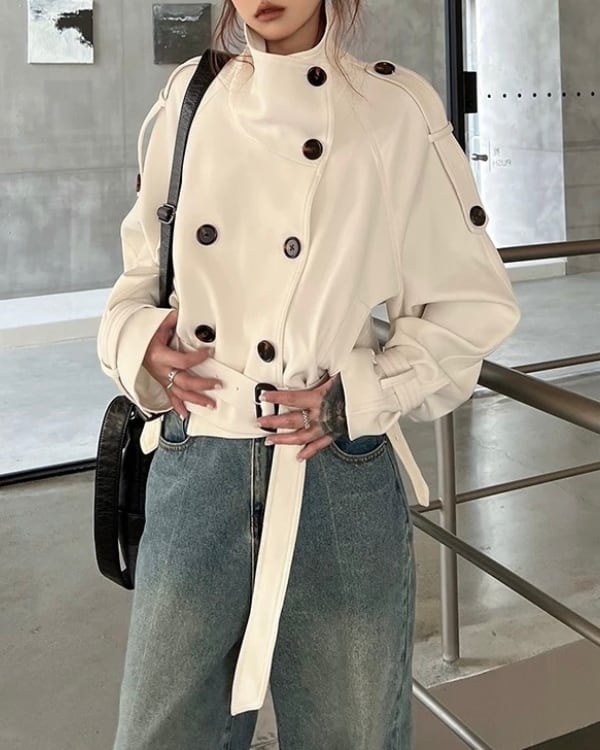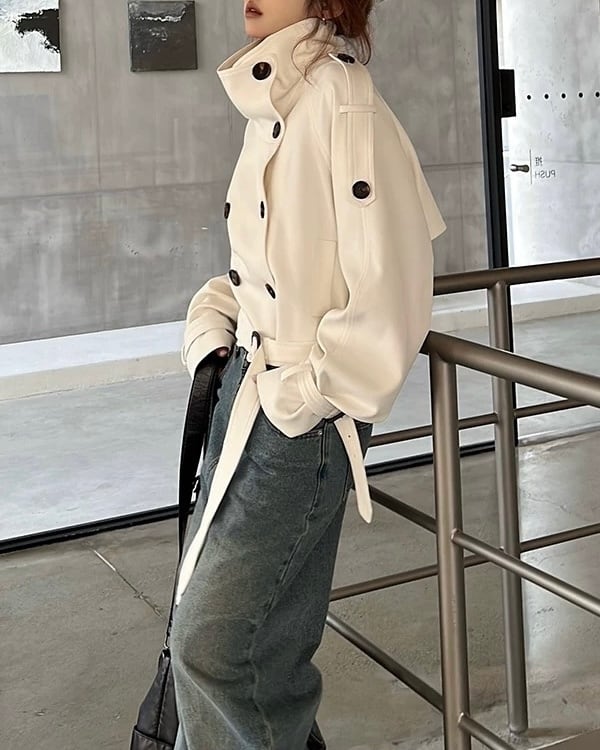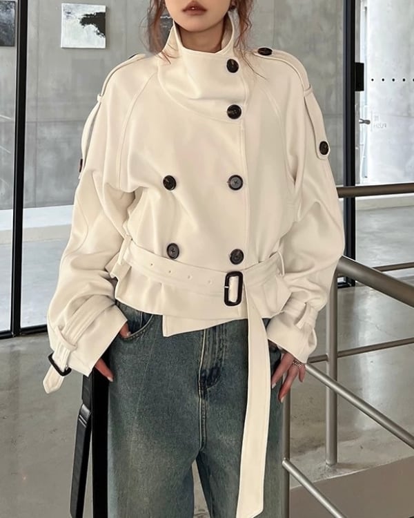 ショート丈のトレンチデザインで、全体をすっきりまとめたジャケット。立ち上がりのある襟元とダブルボタン仕様が、構築的な印象をつくります。