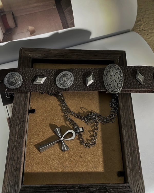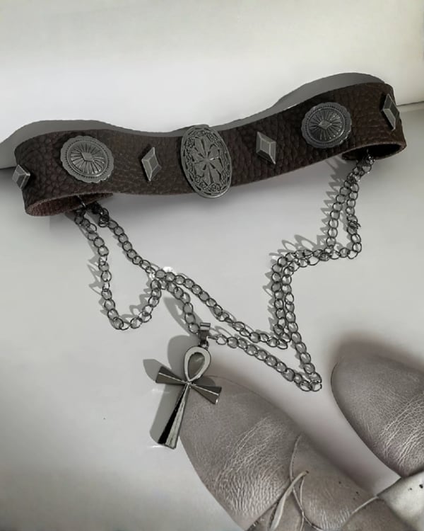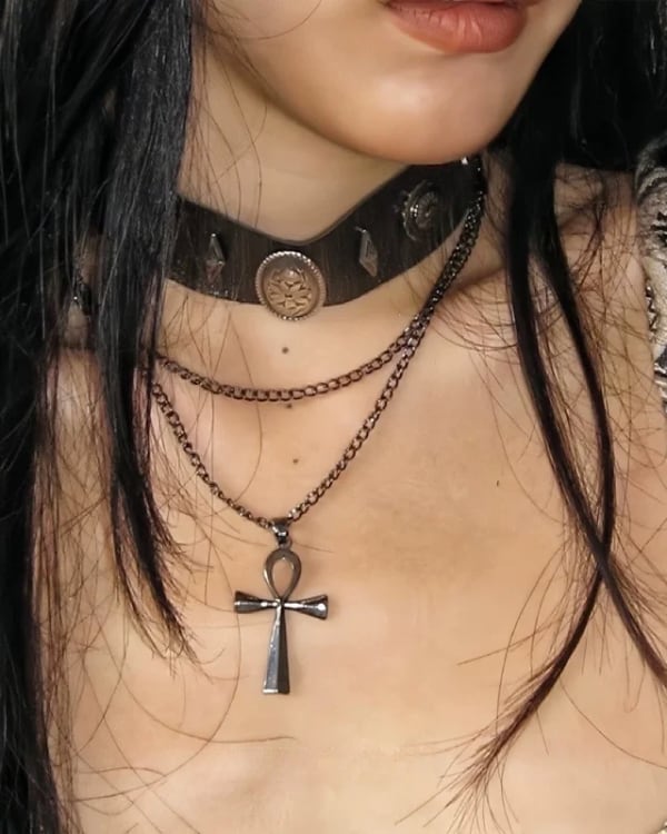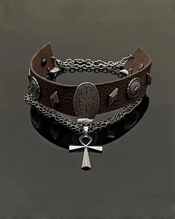 フェイクレザーのチョーカーに、チェーンとクロスモチーフを組み合わせたネックレス。メタルパーツの配置が首元にアクセントを加え、シンプルすぎない印象。
