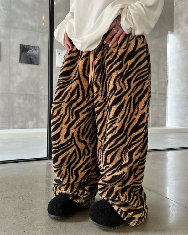 起毛感のあるゼブラ柄が、スタイリングに表情を加えるワイドパンツ。ボリュームのあるシルエットで、ルーズさの中にモードなバランスを演出。