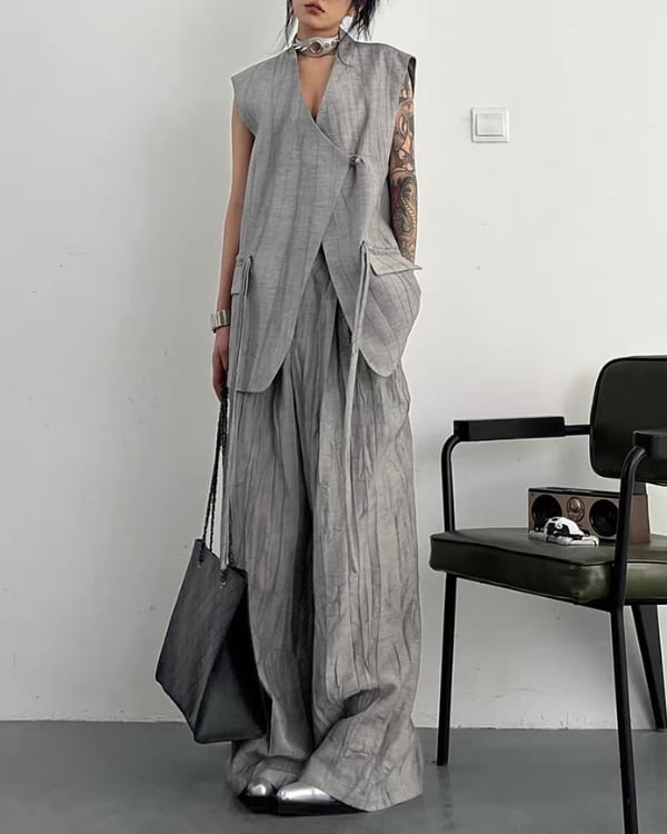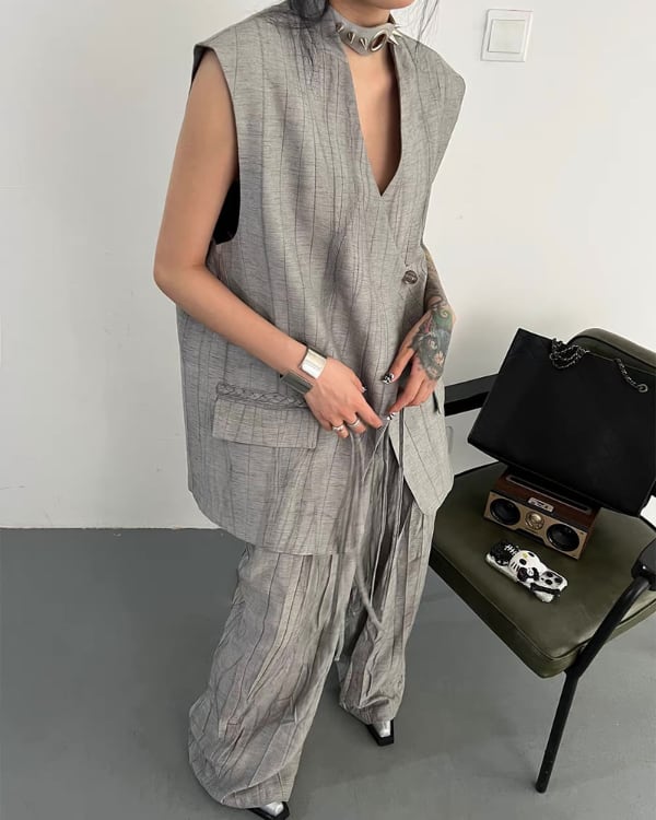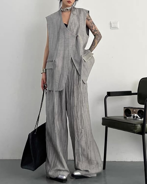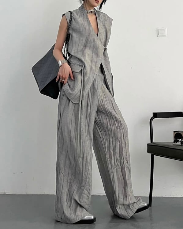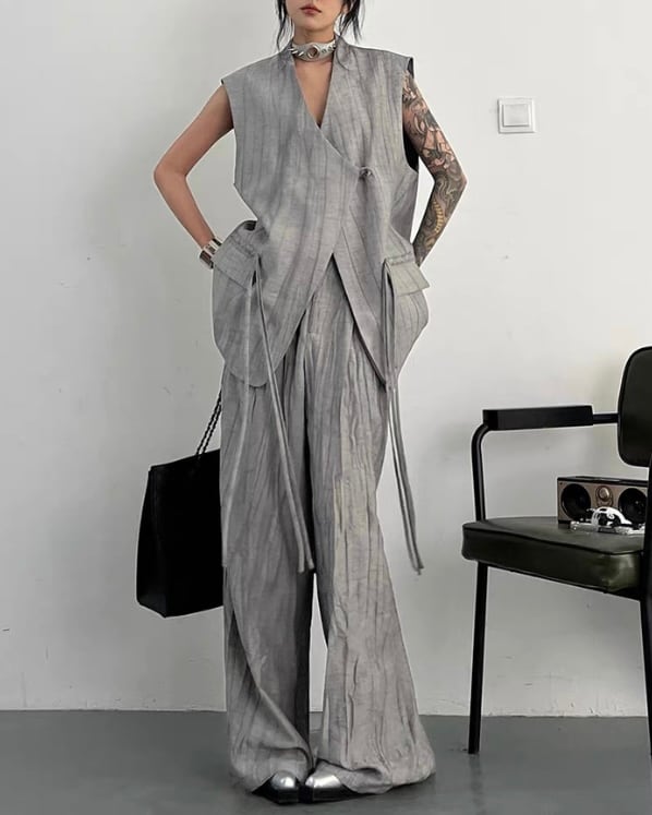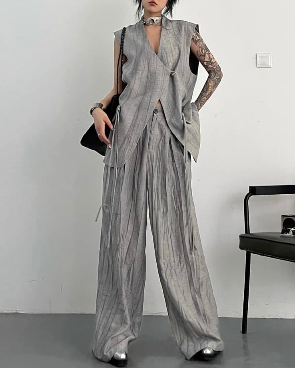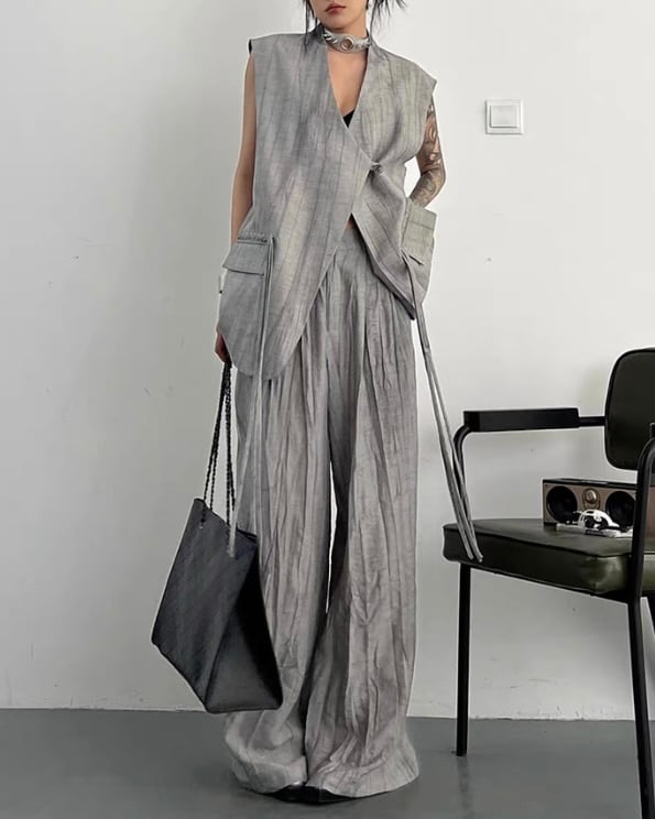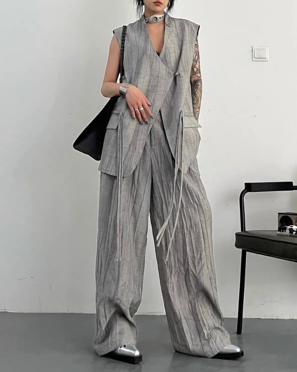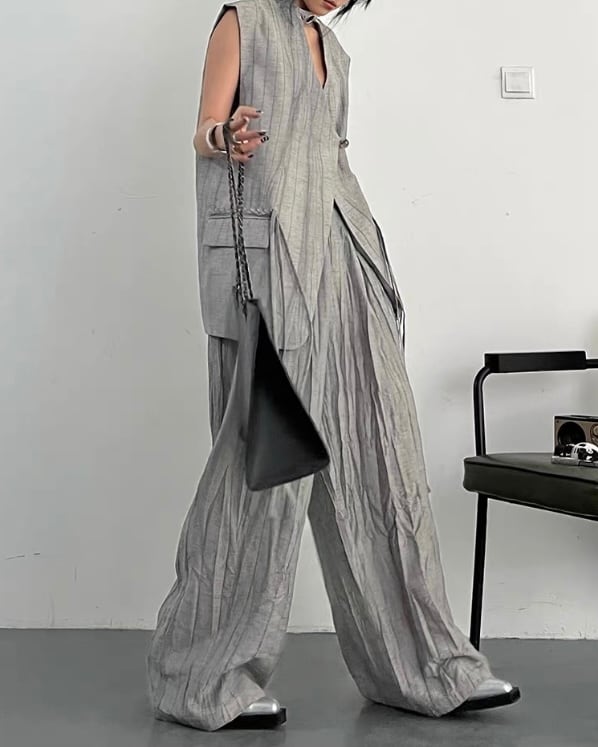 ロング丈ベストとワイドパンツを組み合わせた、モードな雰囲気のセットアップ。縦に流れる生地の表情とゆったりしたシルエットが、存在感のあるバランスを演出。