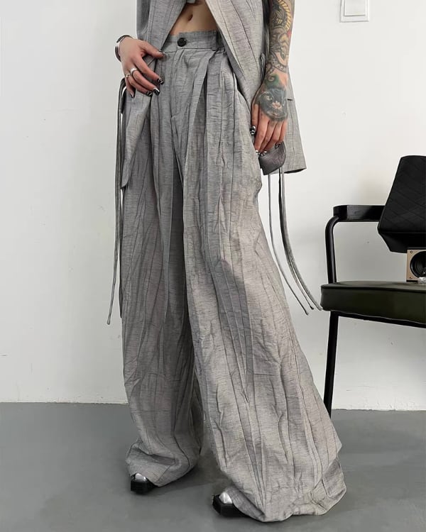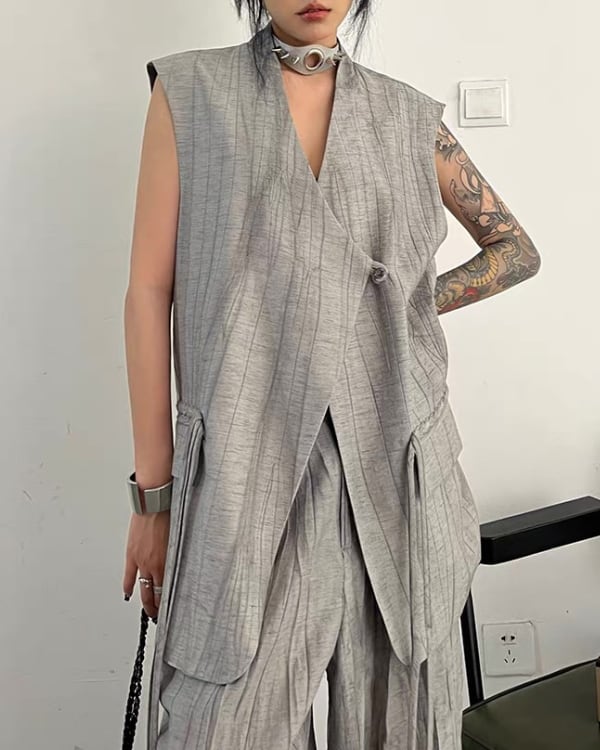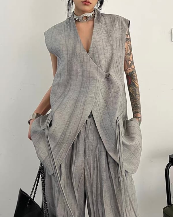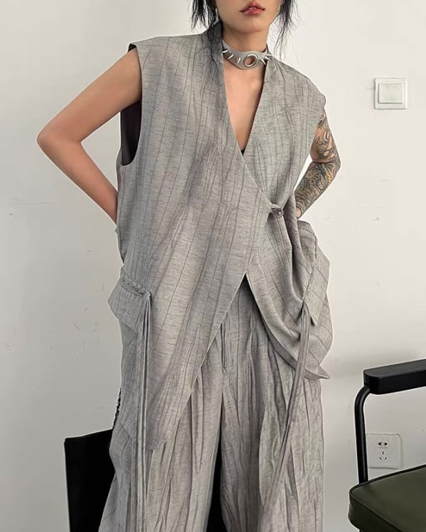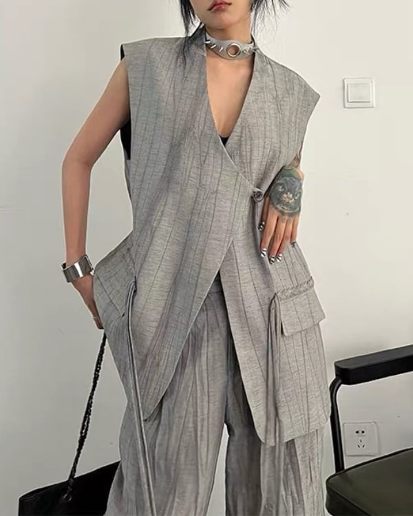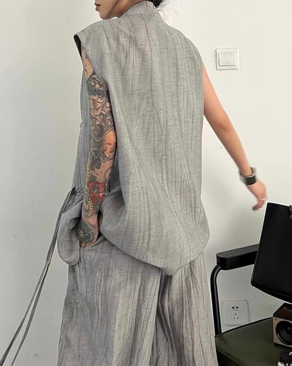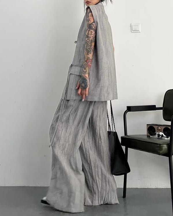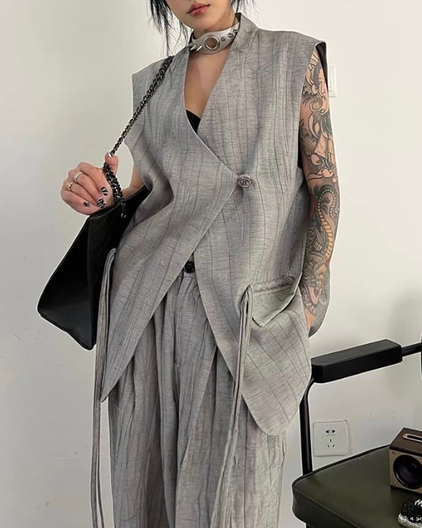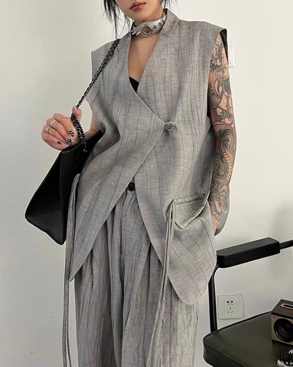 ロング丈ベストとワイドパンツを組み合わせた、モードな雰囲気のセットアップ。縦に流れる生地の表情とゆったりしたシルエットが、存在感のあるバランスを演出。