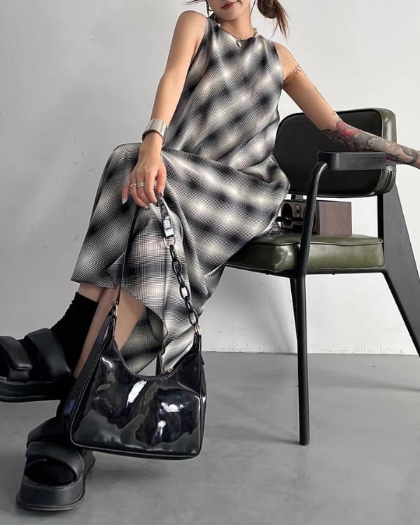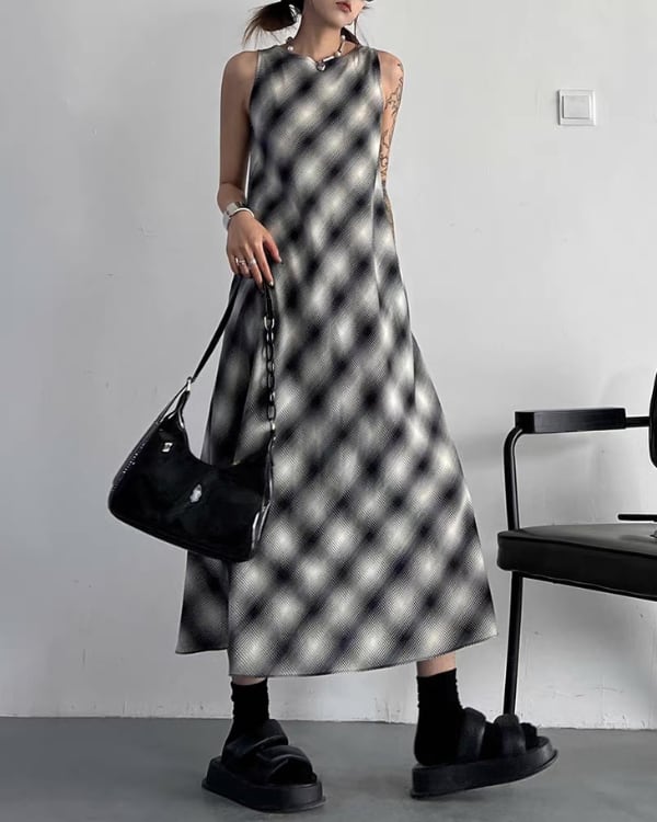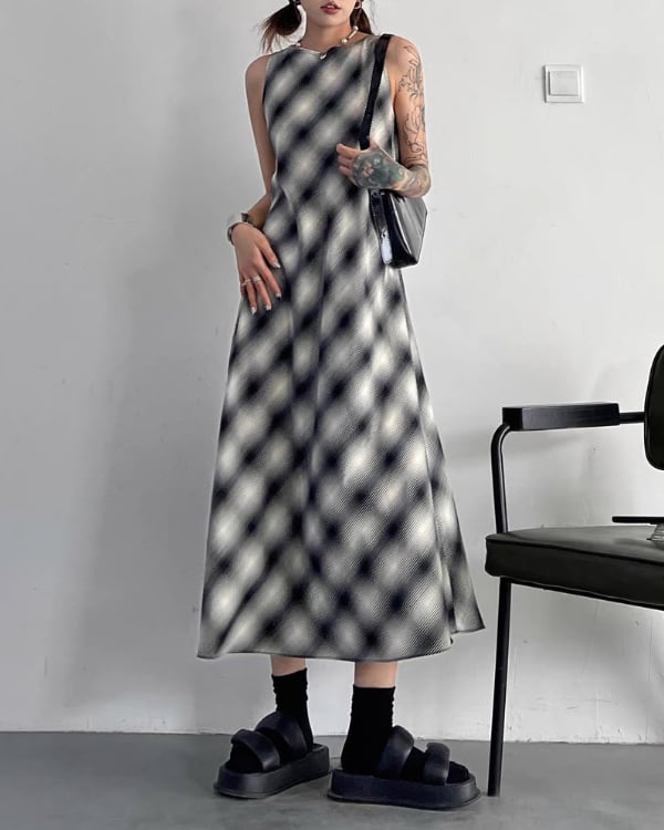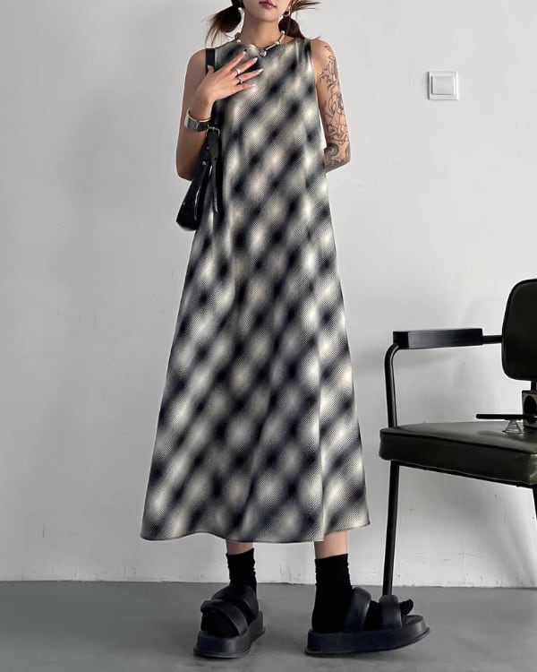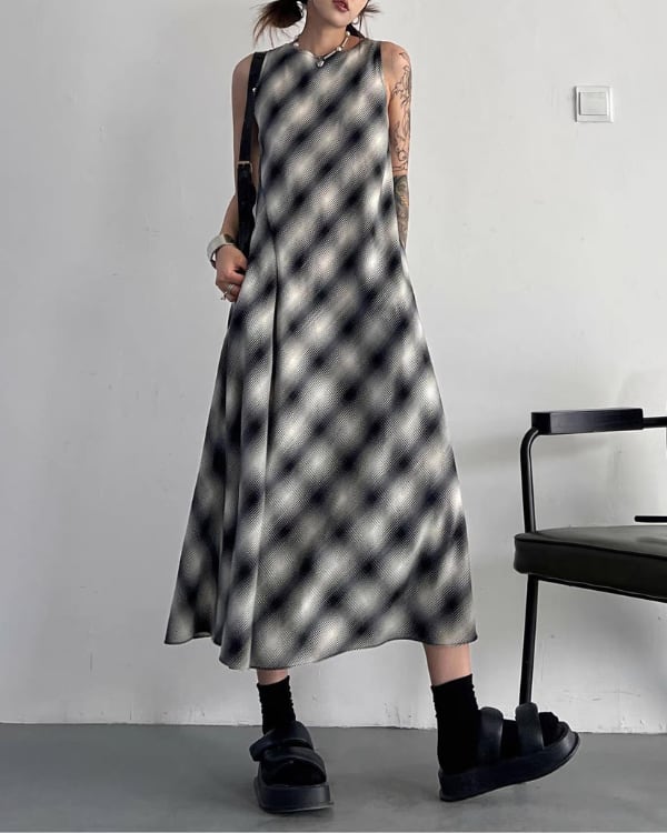 ぼかしたようなチェック柄が印象的なノースリーブワンピース。程よく広がるシルエットで、動きに合わせて軽やかなラインが出るデザイン。