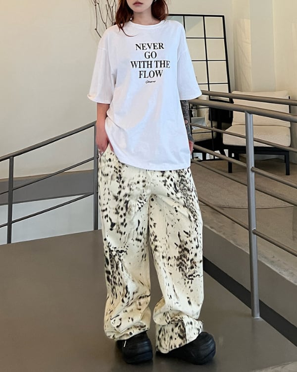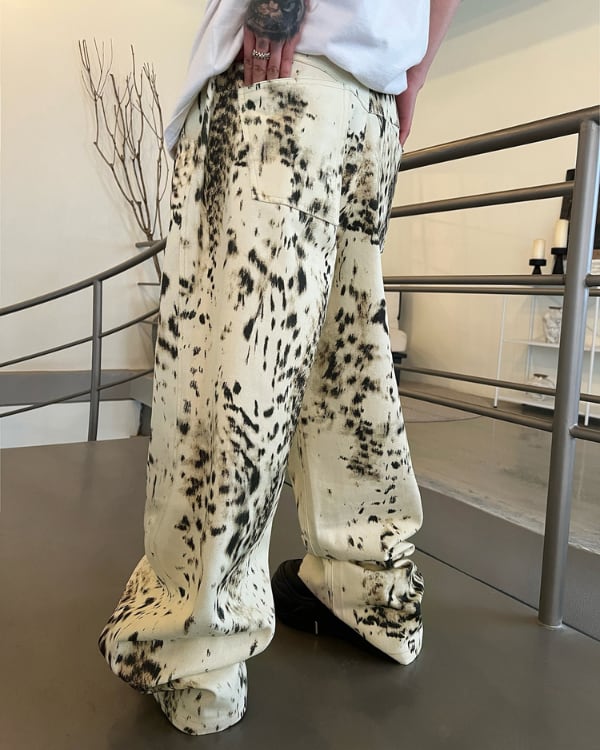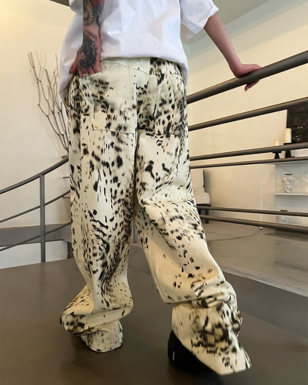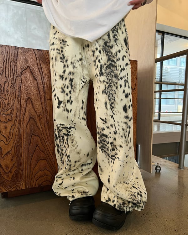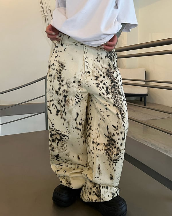 大胆なアブストラクト柄が印象的なワイドパンツ。ルーズなシルエットとボリューム感のあるフォルムが特徴のデザイン。