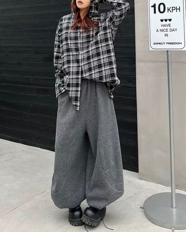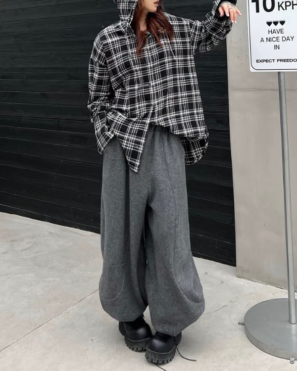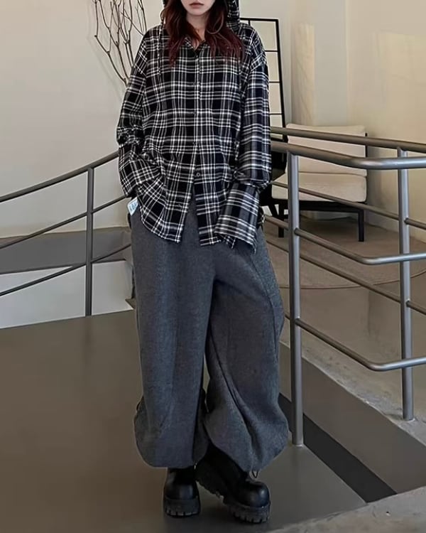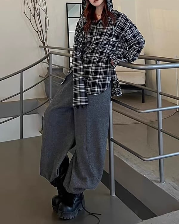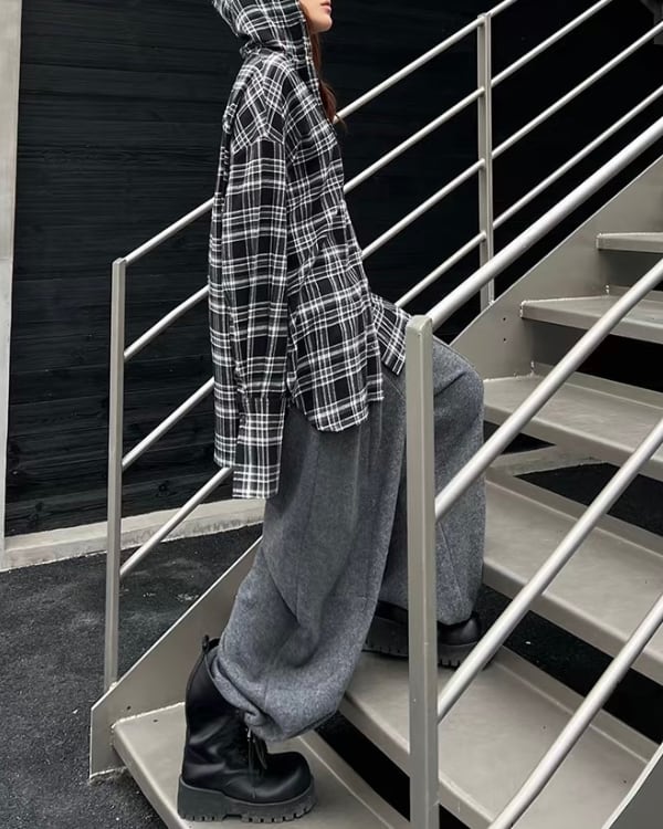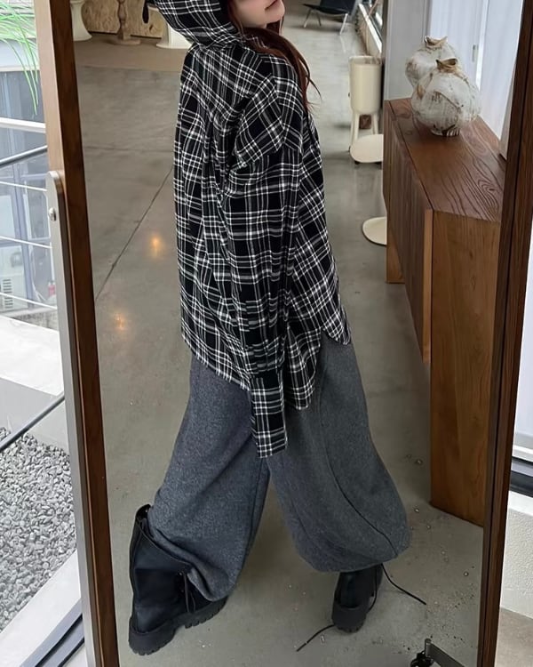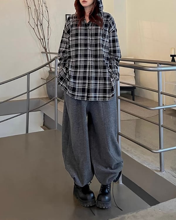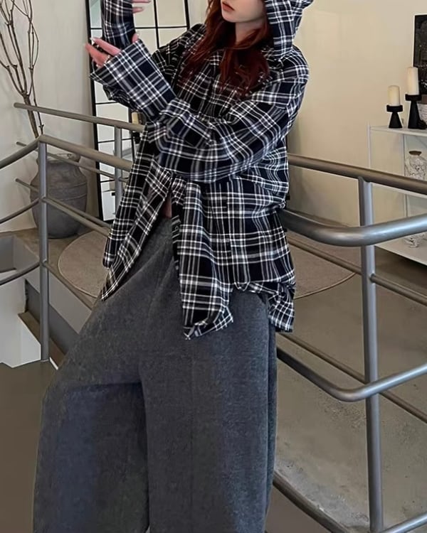 フード付きデザインとモノトーンチェックが目を引くシャツ。ゆとりのあるシルエットと長めの丈感で、抜け感のあるバランスに。
