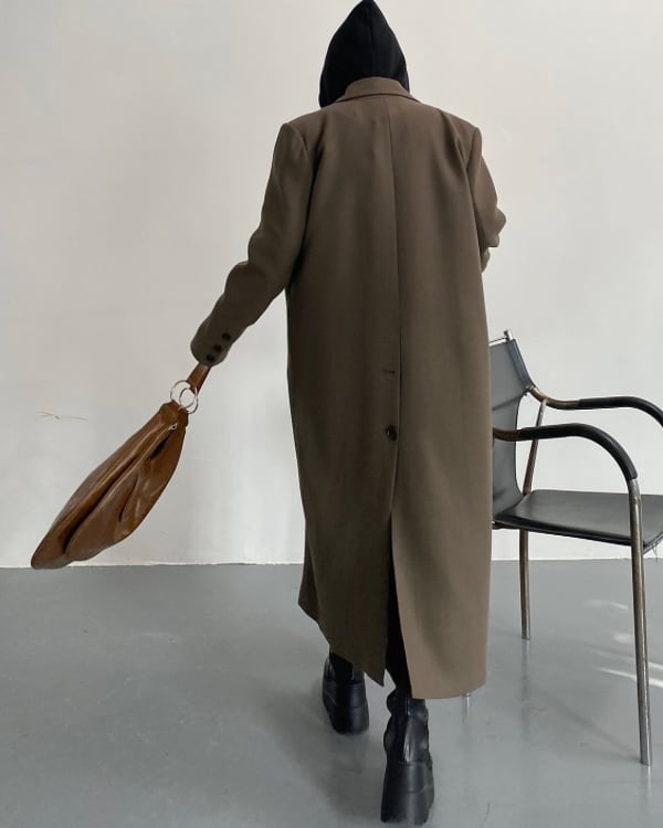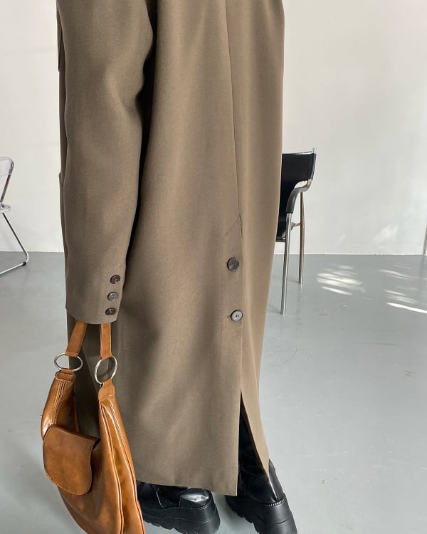 胸ポケットやサイドポケットを配置したロングコート。ダブルボタン仕様と長めの着丈が縦のラインを強調し、すっきりとしたシルエットに仕上がるデザイン。
