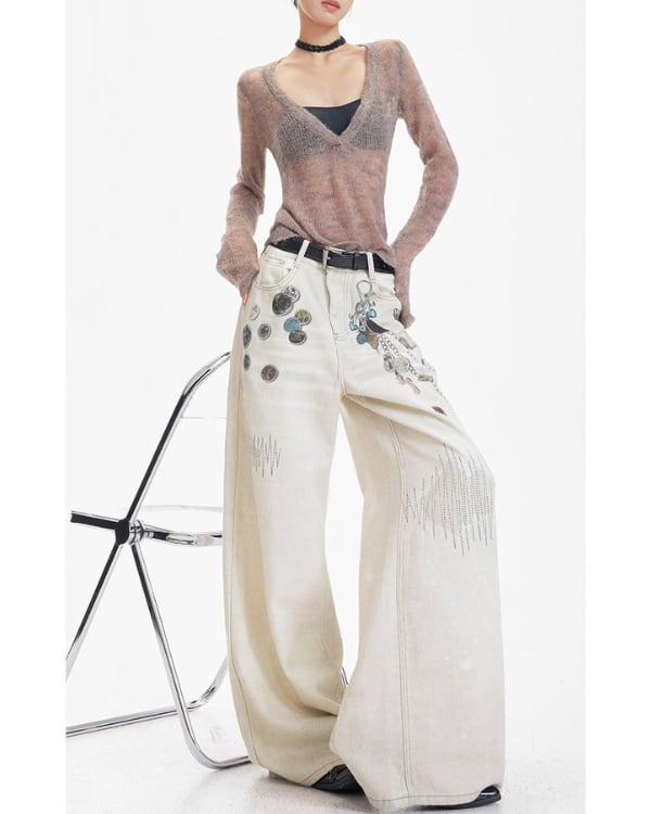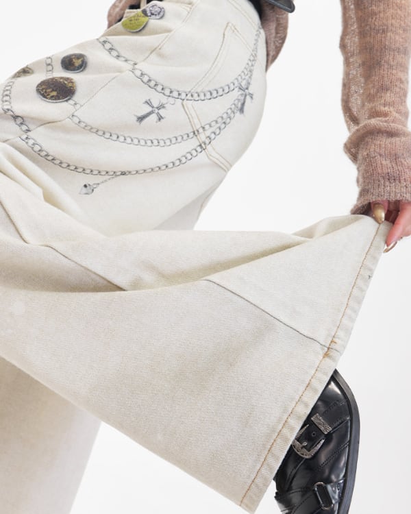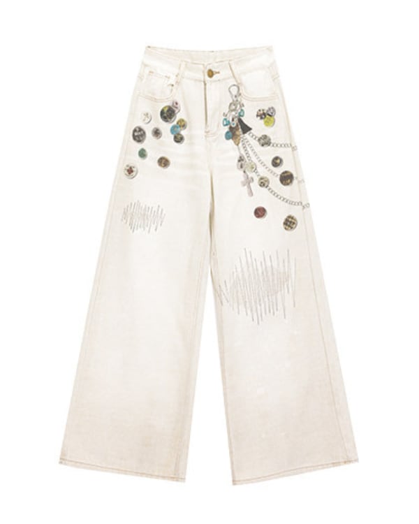 チェーンモチーフやコイン風パーツを散りばめたデザインが目を引くワイドデニムパンツ。ゆったりと広がるシルエットとフロントの装飾ディテールがスタイリングに個性を加えます。