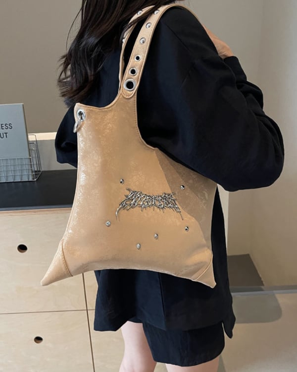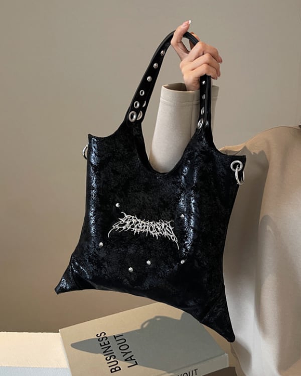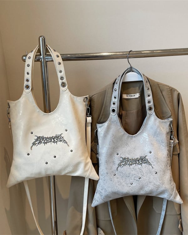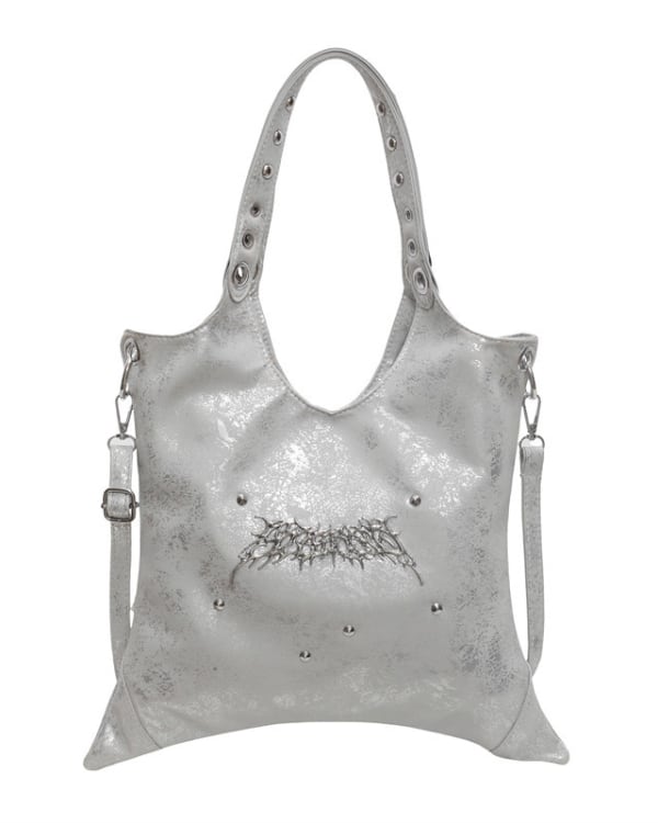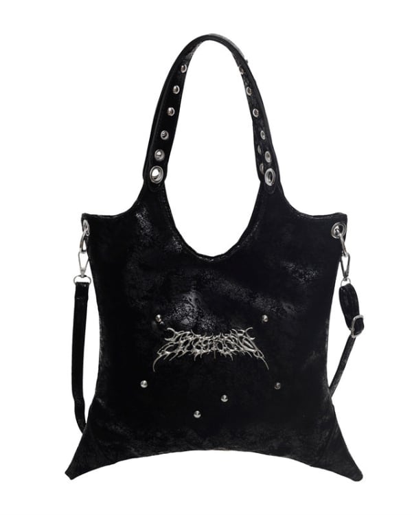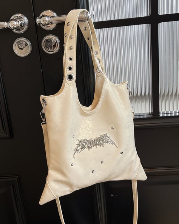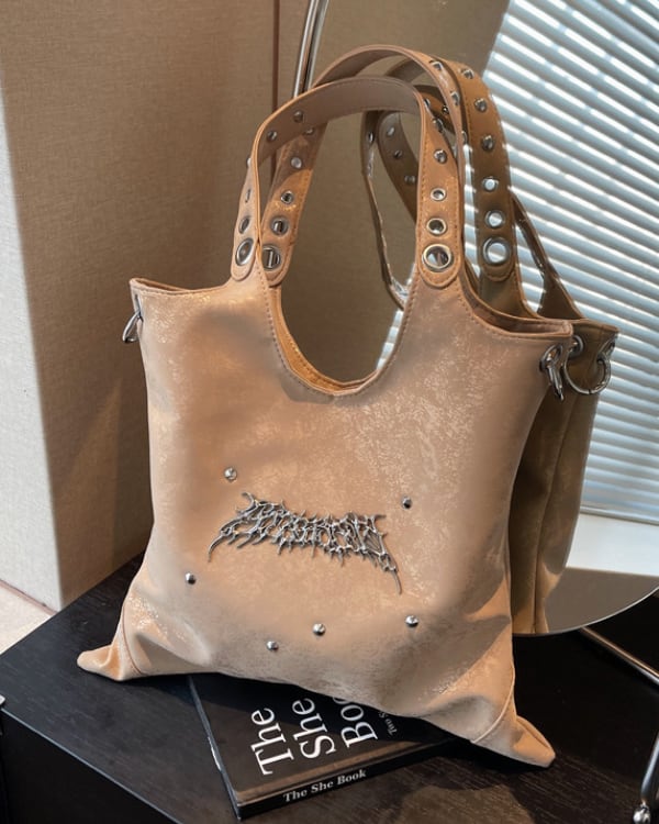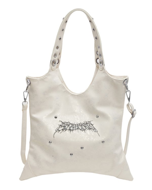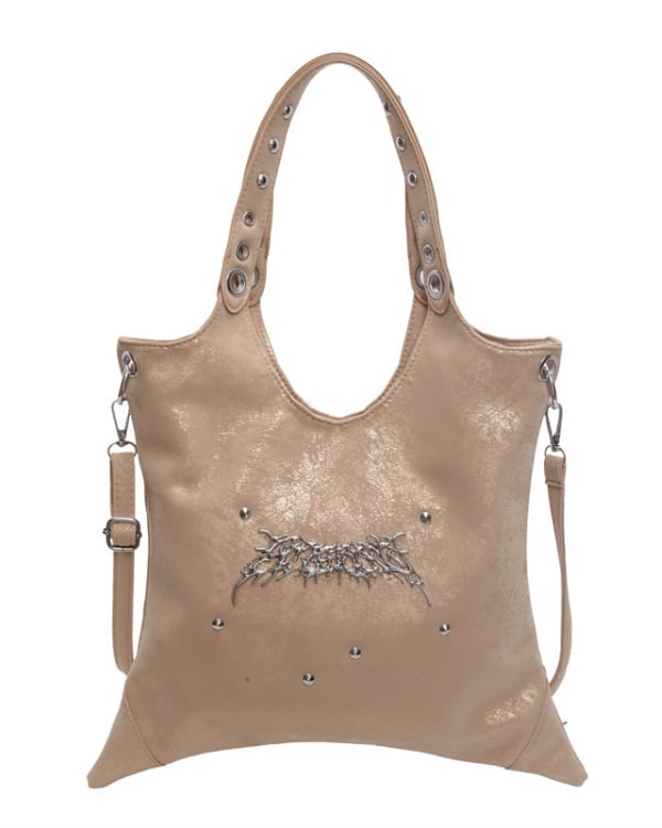 フロントのロゴパーツとスタッズ装飾、アイレット付きハンドルが目を引く2wayバッグ。ワンショルダーと斜め掛けに対応するストラップ仕様に加え、マグネットボタン開閉と内側ポケット付きで使いやすさも備えたデザイン。