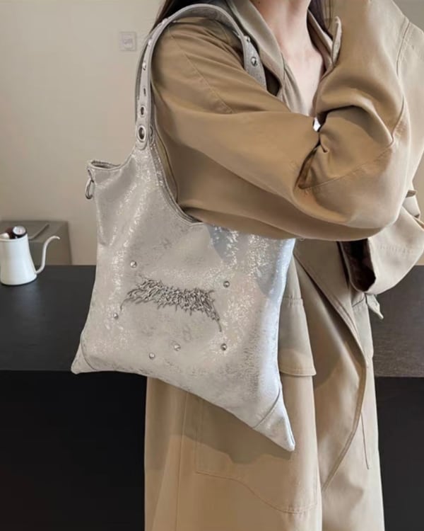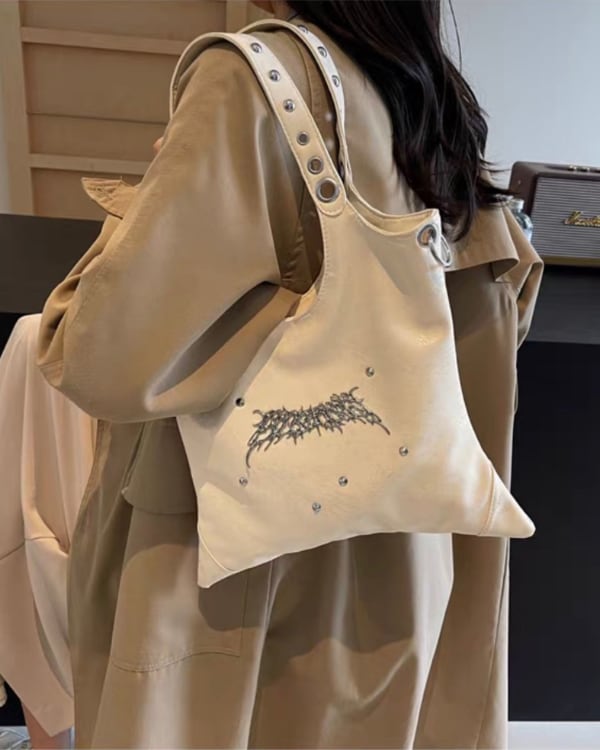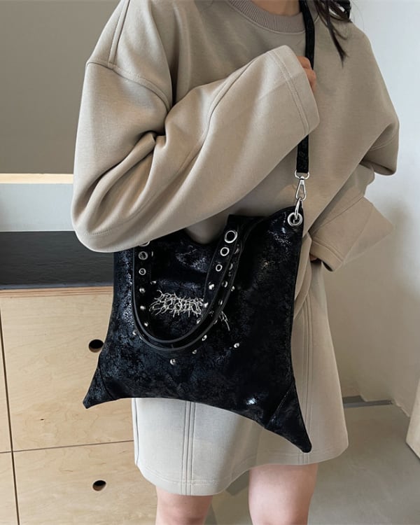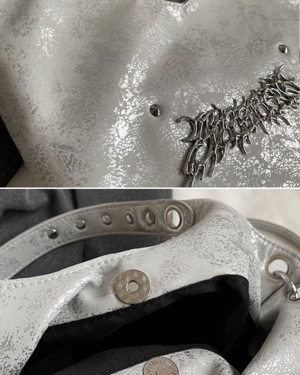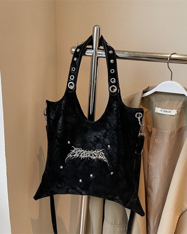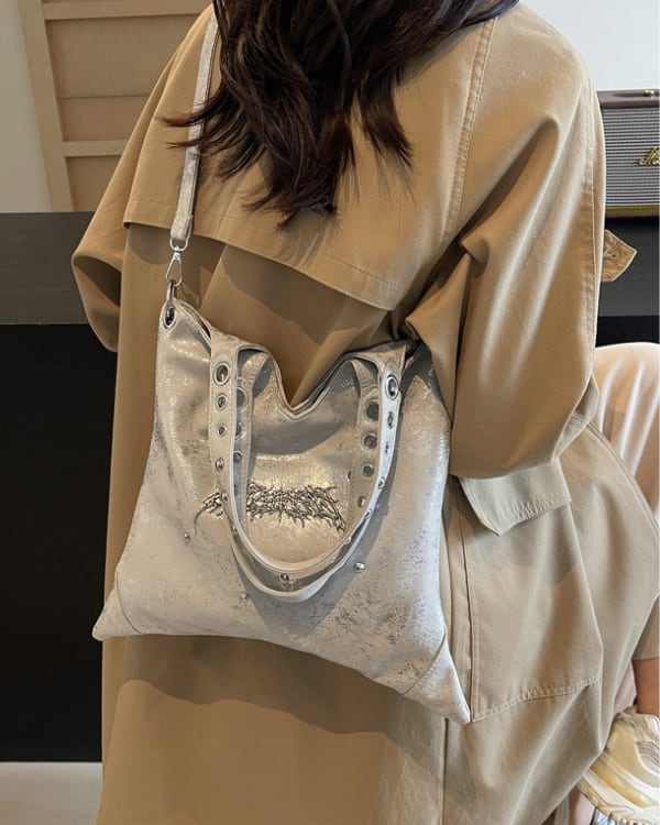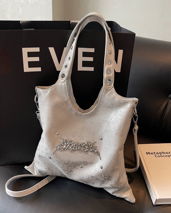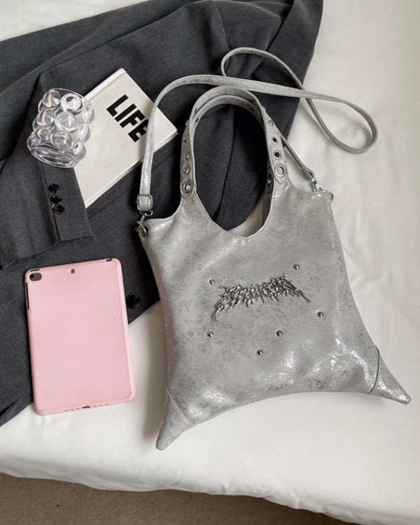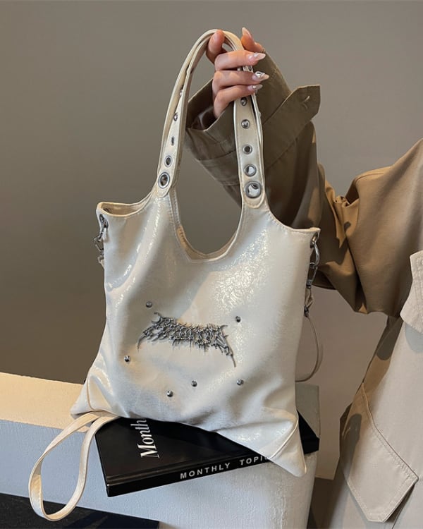 フロントのロゴパーツとスタッズ装飾、アイレット付きハンドルが目を引く2wayバッグ。ワンショルダーと斜め掛けに対応するストラップ仕様に加え、マグネットボタン開閉と内側ポケット付きで使いやすさも備えたデザイン。