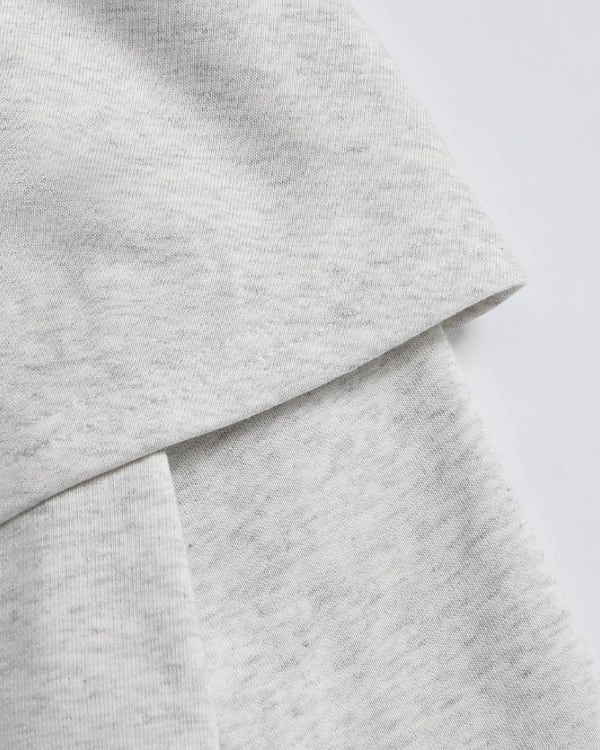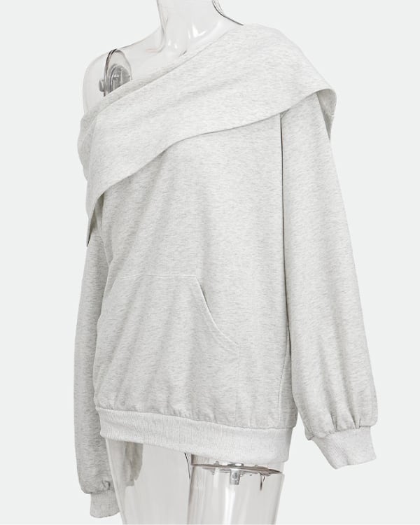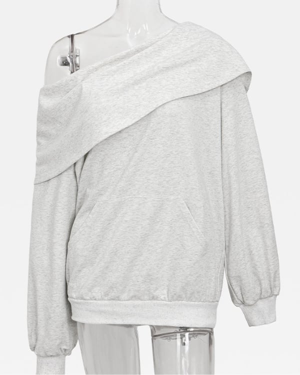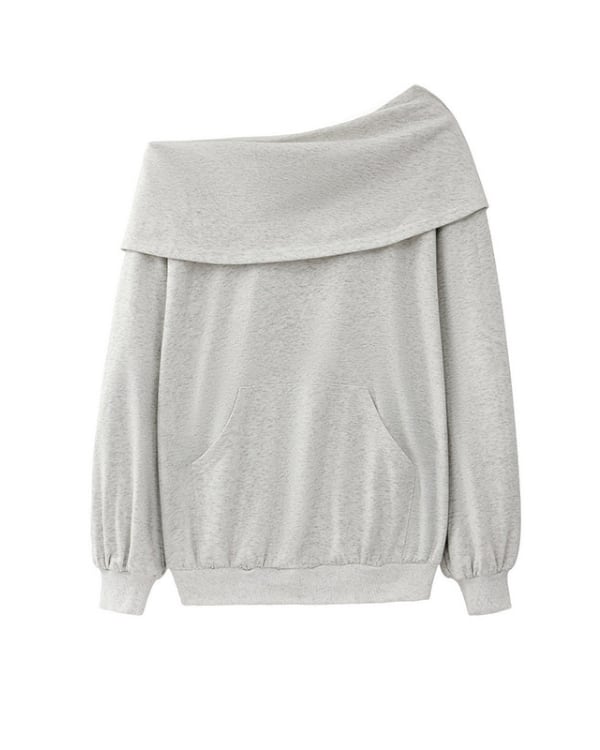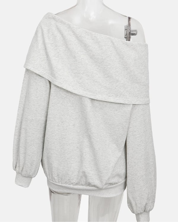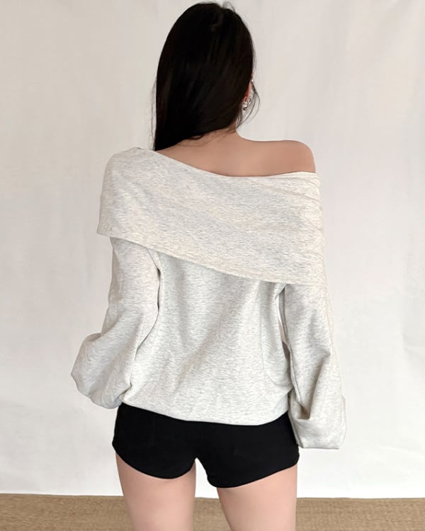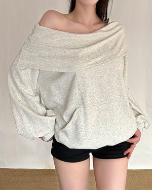 折り返したネックラインが目を引く、オフショルダープルオーバー。スウェットライクな生地感とボリューム袖で、ラフに崩したようなバランスに仕上がります。