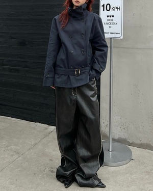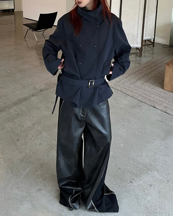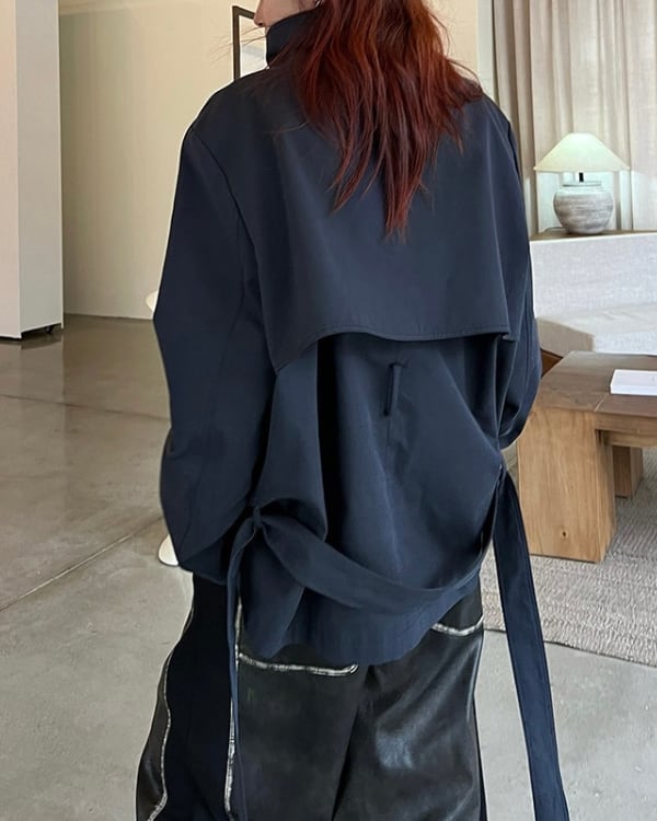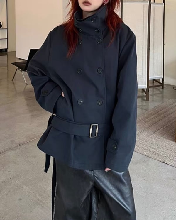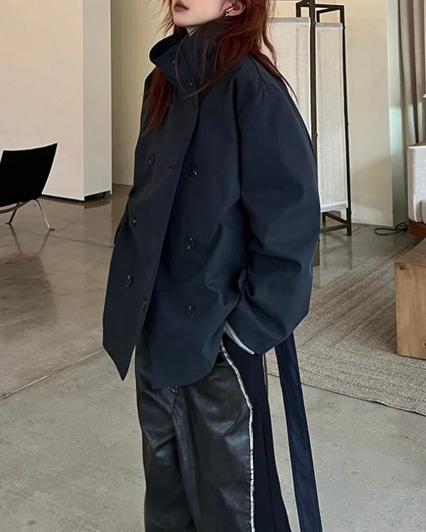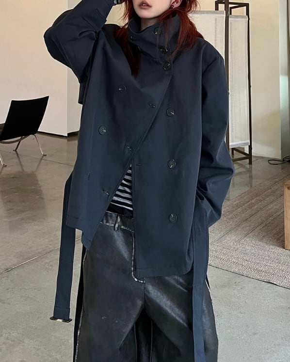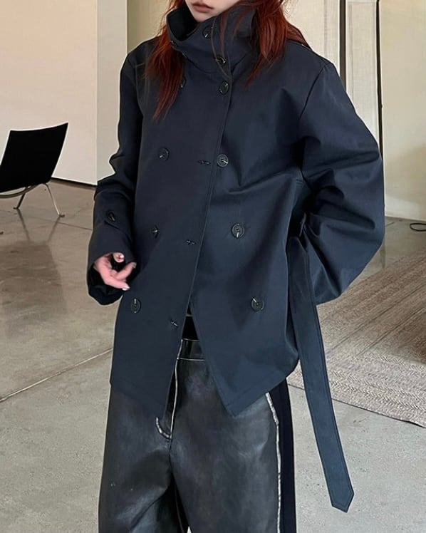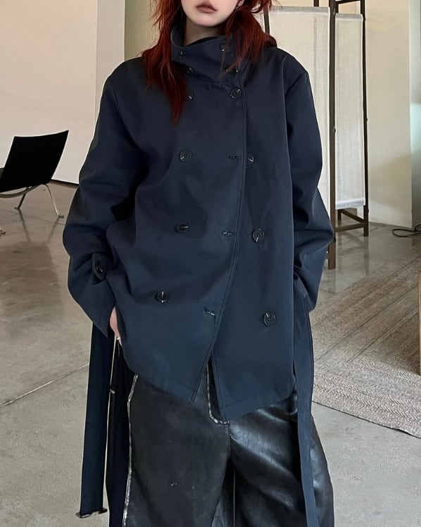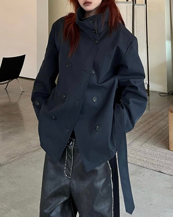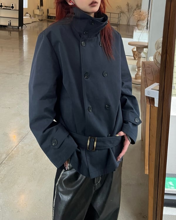 立ち上がりのあるハイネックと斜めに重なるフロントが印象的なブルゾン。ダブルボタンとウエストベルトを組み合わせることで、前を閉じた時の見え方に立体感が生まれます。