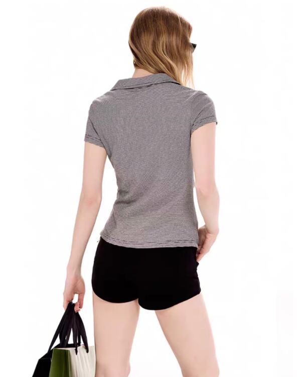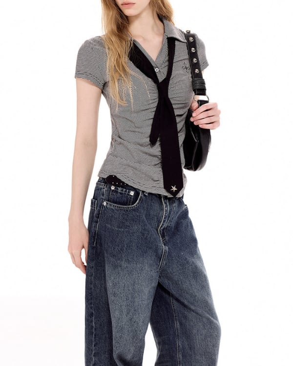 ストライプにシャーリングを重ねた襟付きトップス。クロス刺繍を胸元に配置し視線を集中。