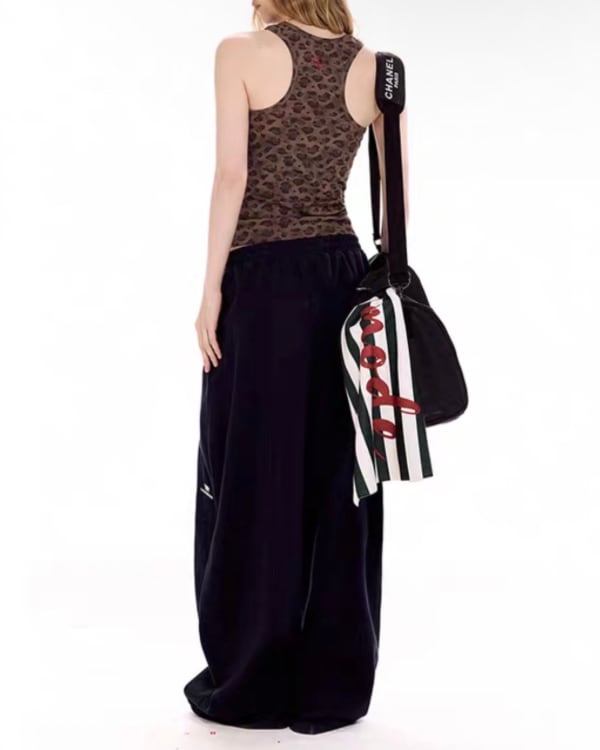 細かなレオパード柄に、背面の赤いワンポイントが映えるタンクトップ。広めに開いた首元と腕まわりに、身体に沿うすっきりしたラインを合わせたアイテム。