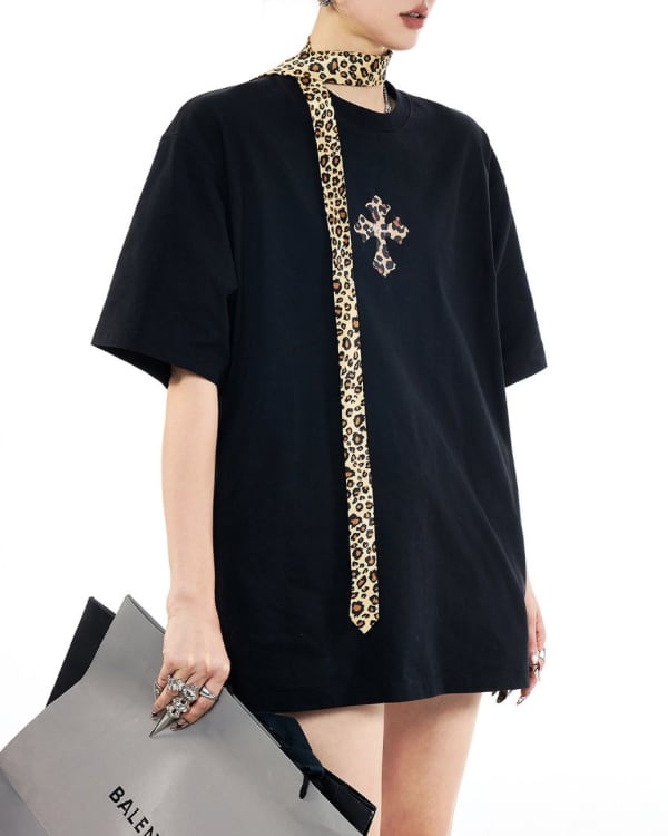レオパードクロスを胸元に配したTシャツ。ドロップショルダーと広がるフォルムでシルエットを崩します。