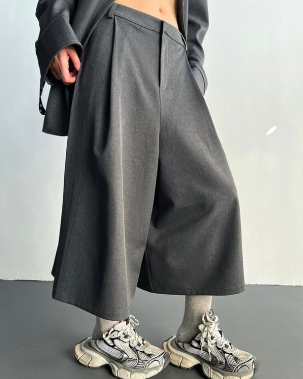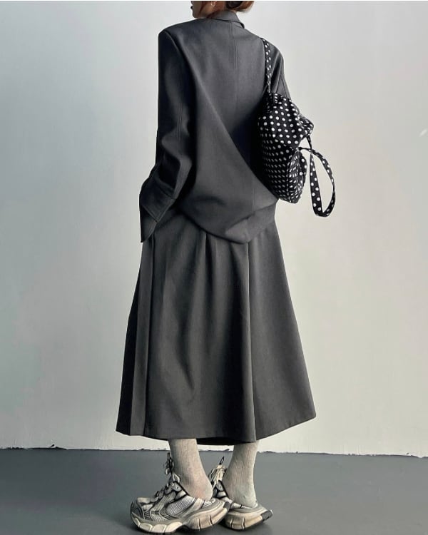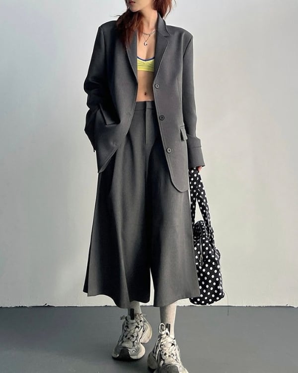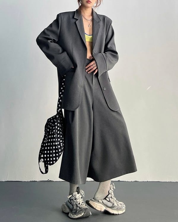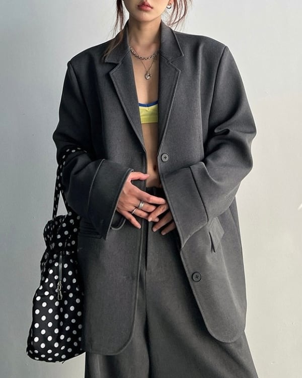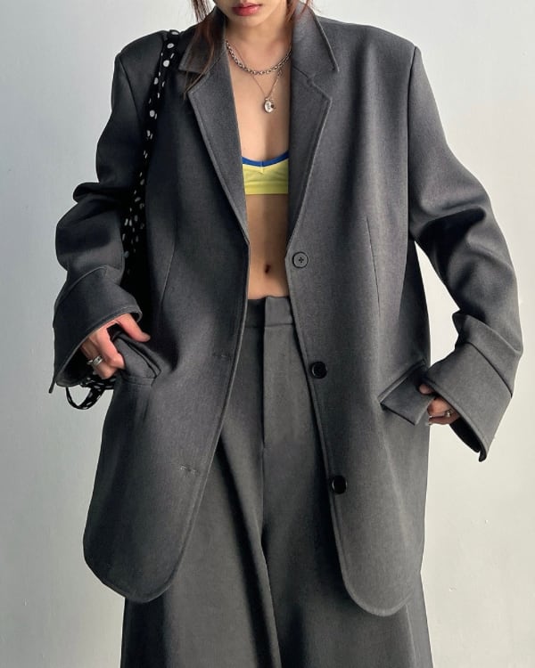 肩まわりにゆとりを持たせたジャケットとワイドシルエットのボトムを組み合わせたセットアップ。長めの着丈と深く入ったタックが、縦に流れるバランスをつくります。