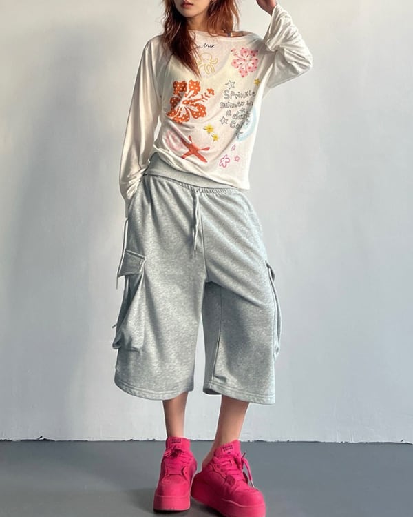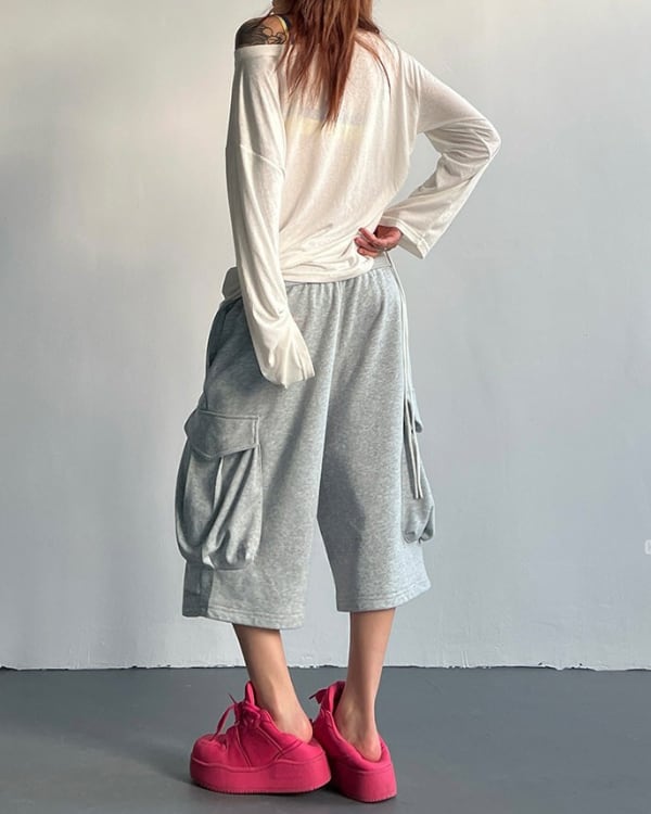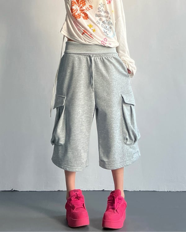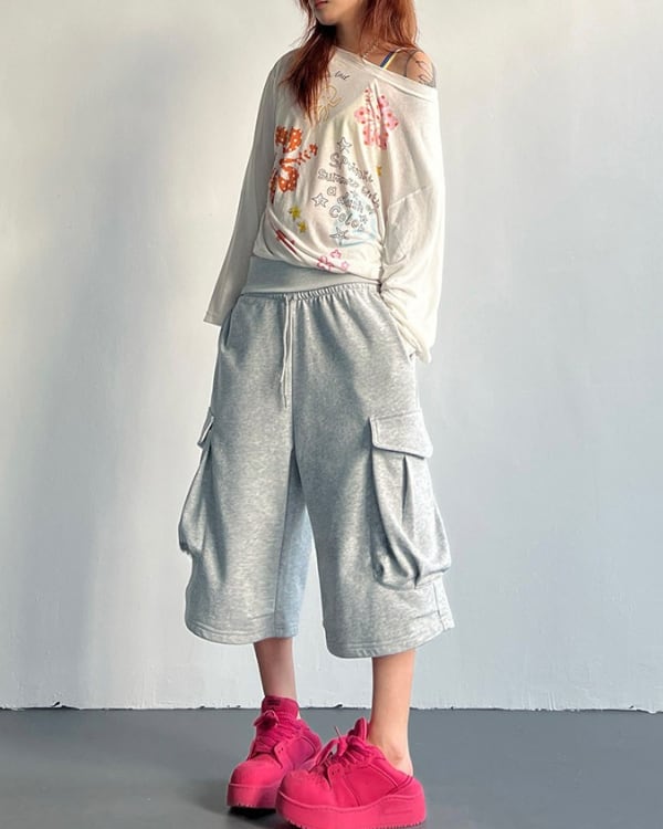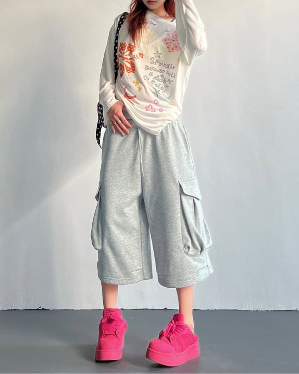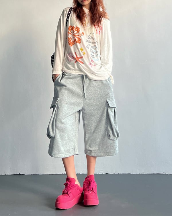 立体感のあるサイドポケットを配した、スウェット素材のカーゴハーフパンツ。ひざ下まで届く丈感とワイドに広がるフォルムが、印象に残るシルエットをつくります。