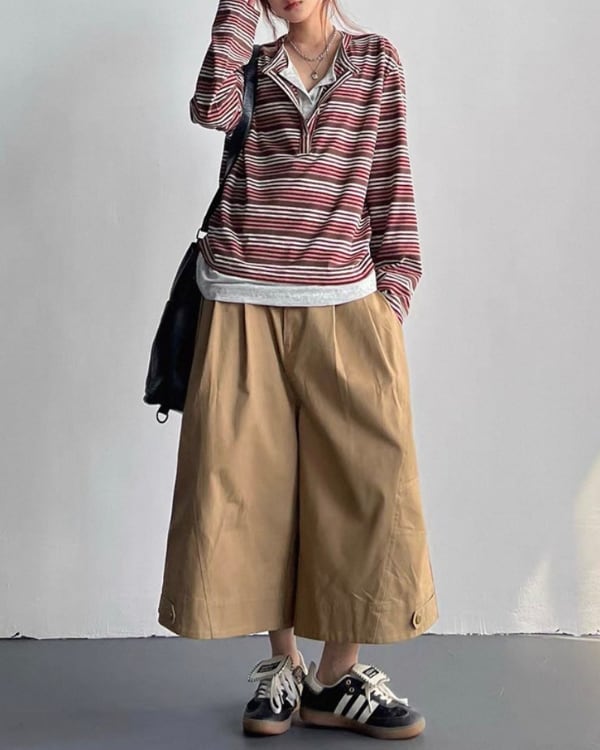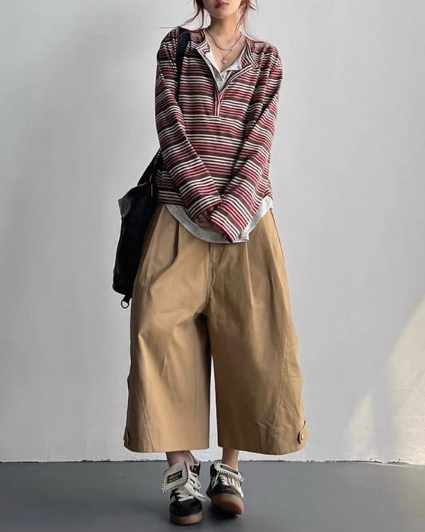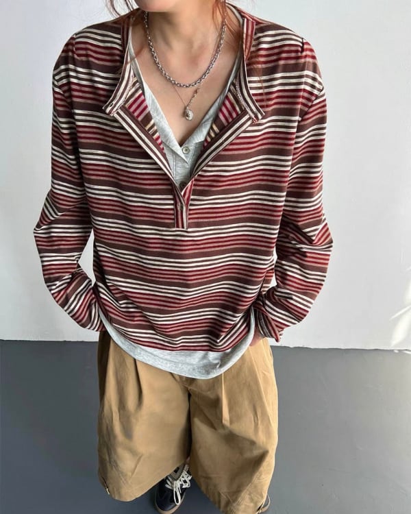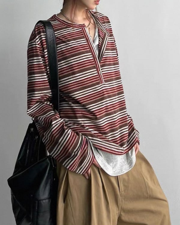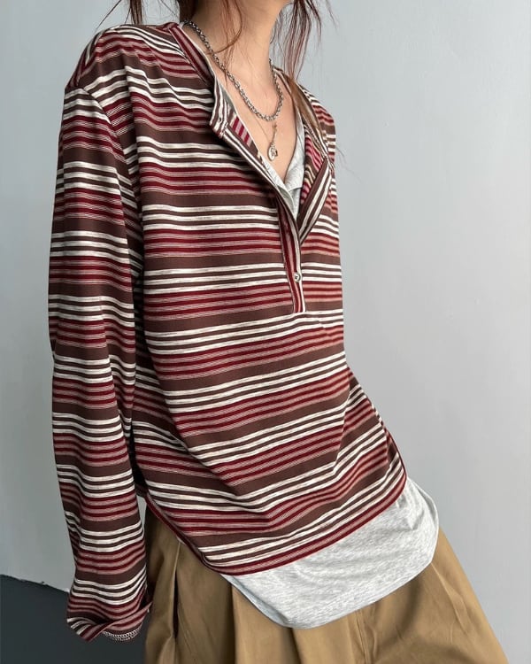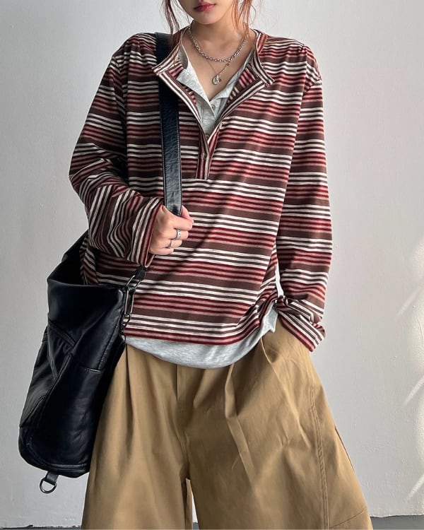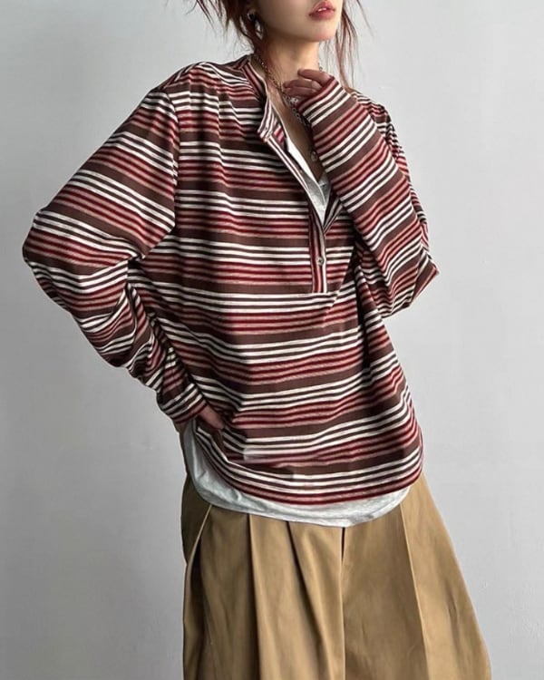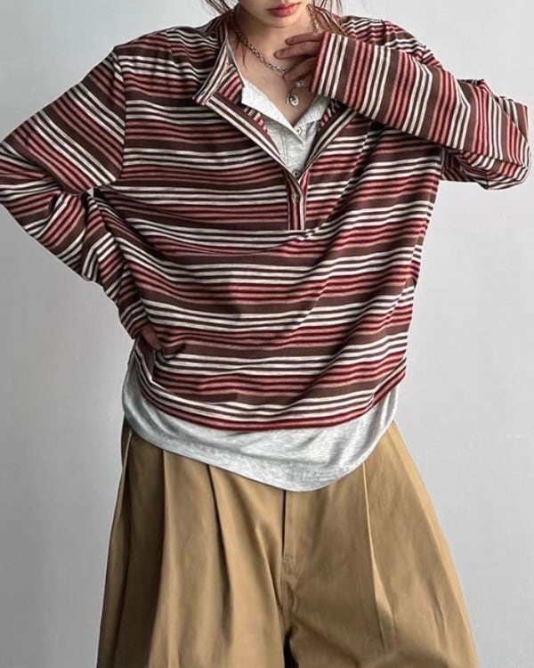 細かなボーダー柄と重ね着風のネックデザインが目を引くトップス。内側を重ねたような首元の見え方が、シンプルな形に奥行きを加えます。
