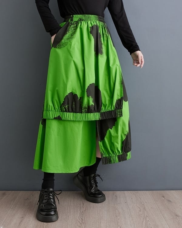 アシンメトリーなデザインと大胆なプリントが特徴のワイドパンツ。